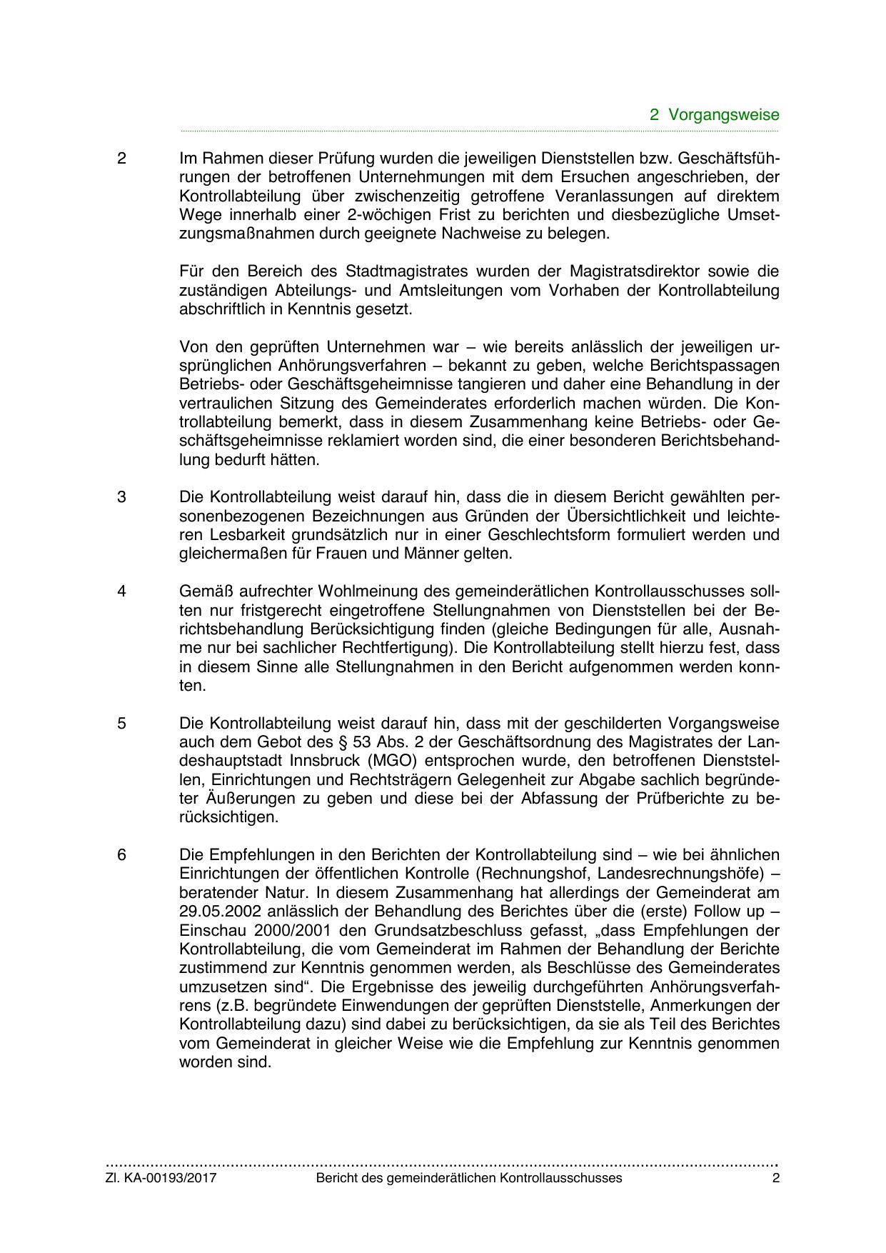 auch dem Gebot des § 53 Abs. 2 der Geschäftsordnung des Magistrates der Landeshauptstadt Innsbruck (MGO) entsprochen wurde, den betroffenen Dienststellen, Einrichtungen und Rechtsträgern Gelegenheit zur Abgabe sachlich begründeter Äußerungen zu geben und diese bei der Abfassung der Prüfberichte zu berücksichtigen.