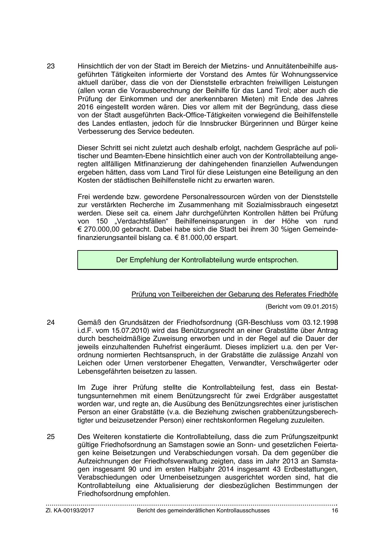 Der Empfehlung der Kontrollabteilung wurde entsprochen.