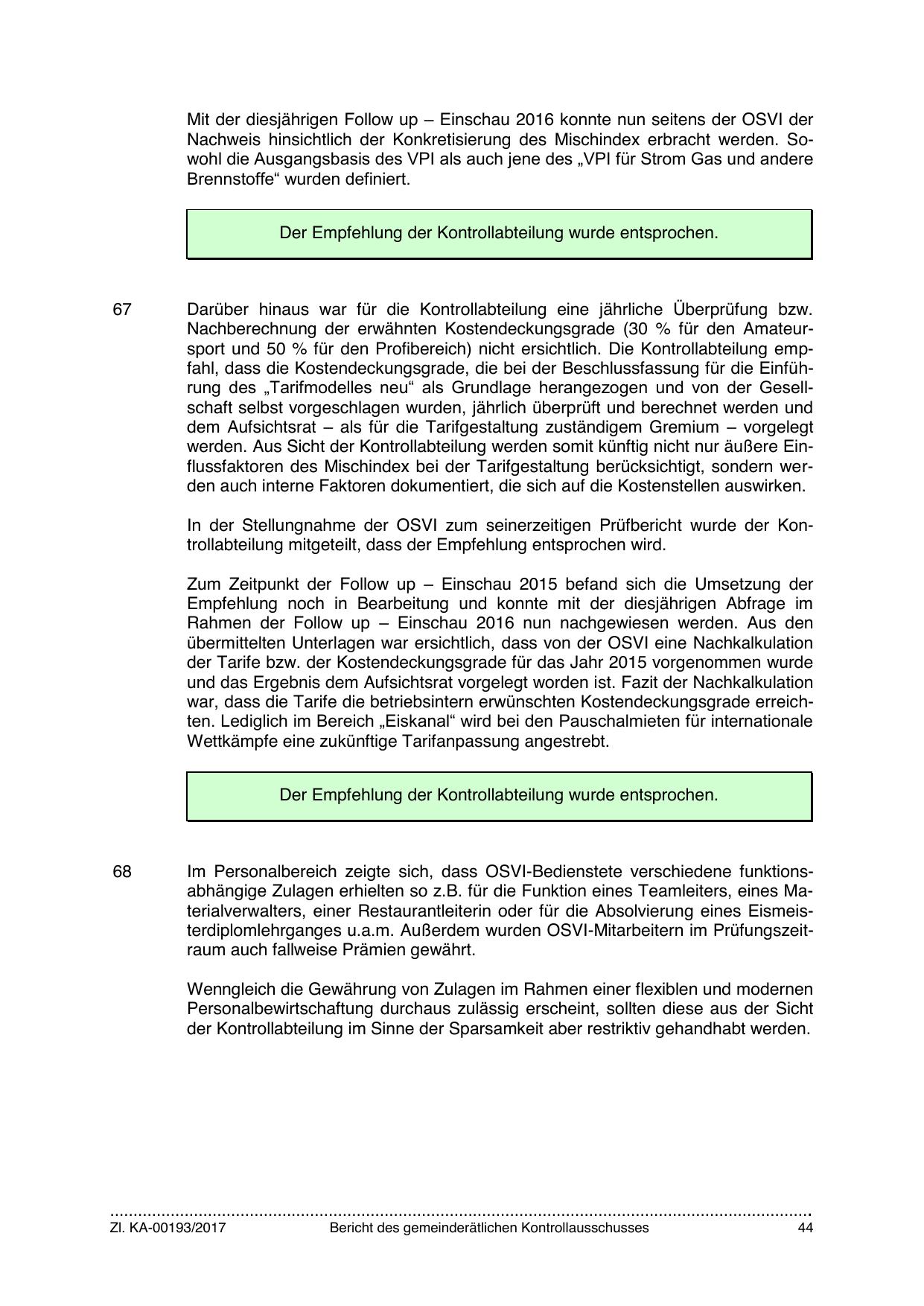Nachberechnung der erwähnten Kostendeckungsgrade (30 % für den Amateursport und 50 % für den Profibereich) nicht ersichtlich. Die Kontrollabteilung empfahl, dass die Kostendeckungsgrade, die bei der Beschlussfassung für die Einführung des „Tarifmodelles neu“ als Grundlage herangezogen und von der Gesellschaft selbst vorgeschlagen wurden, jährlich überprüft und berechnet werden und