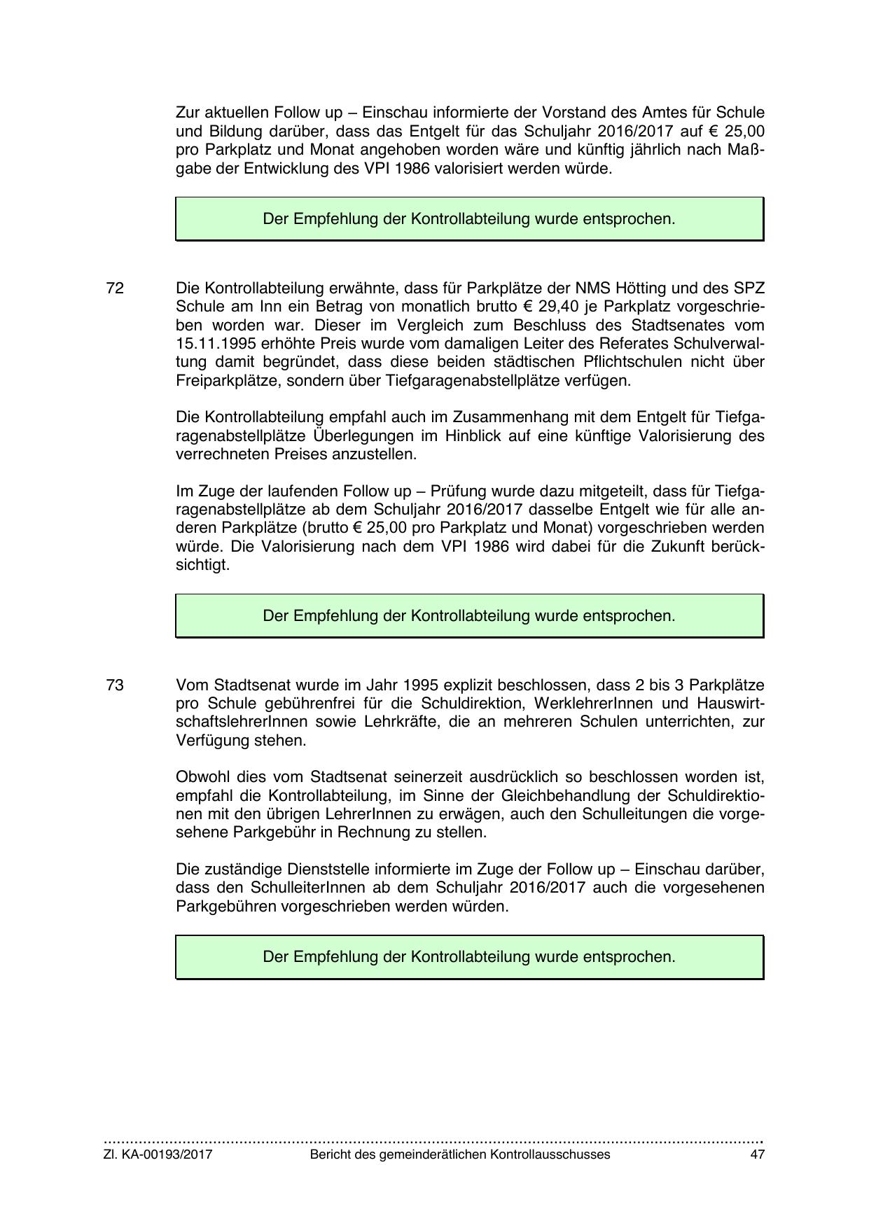 Schule am Inn ein Betrag von monatlich brutto € 29,40 je Parkplatz vorgeschrieben worden war. Dieser im Vergleich zum Beschluss des Stadtsenates vom