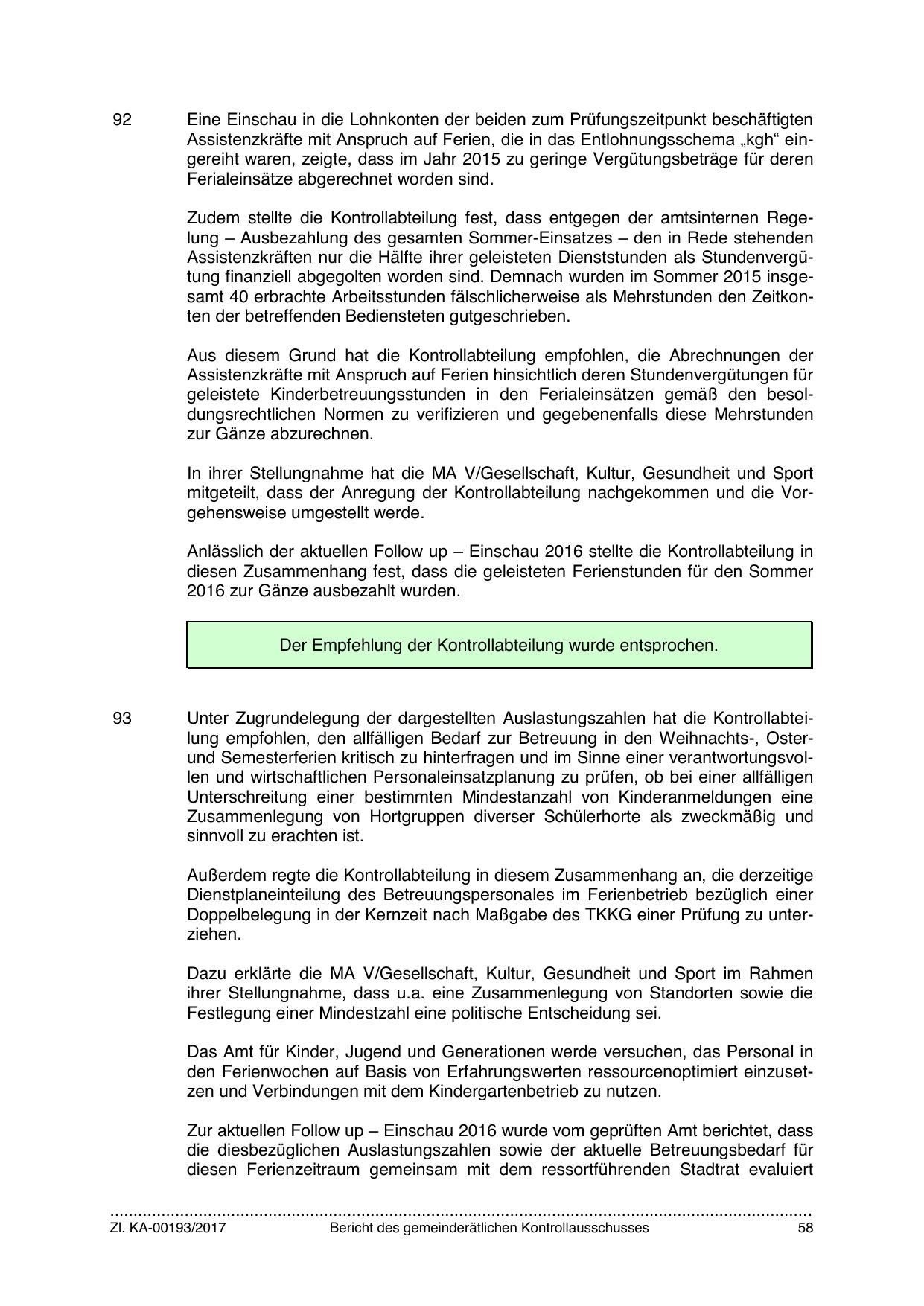 Unter Zugrundelegung der dargestellten Auslastungszahlen hat die Kontrollabteilung empfohlen, den allfälligen Bedarf zur Betreuung in den Weihnachts-, Osterund Semesterferien kritisch zu hinterfragen und im Sinne einer verantwortungsvollen und wirtschaftlichen Personaleinsatzplanung zu prüfen, ob bei einer allfälligen