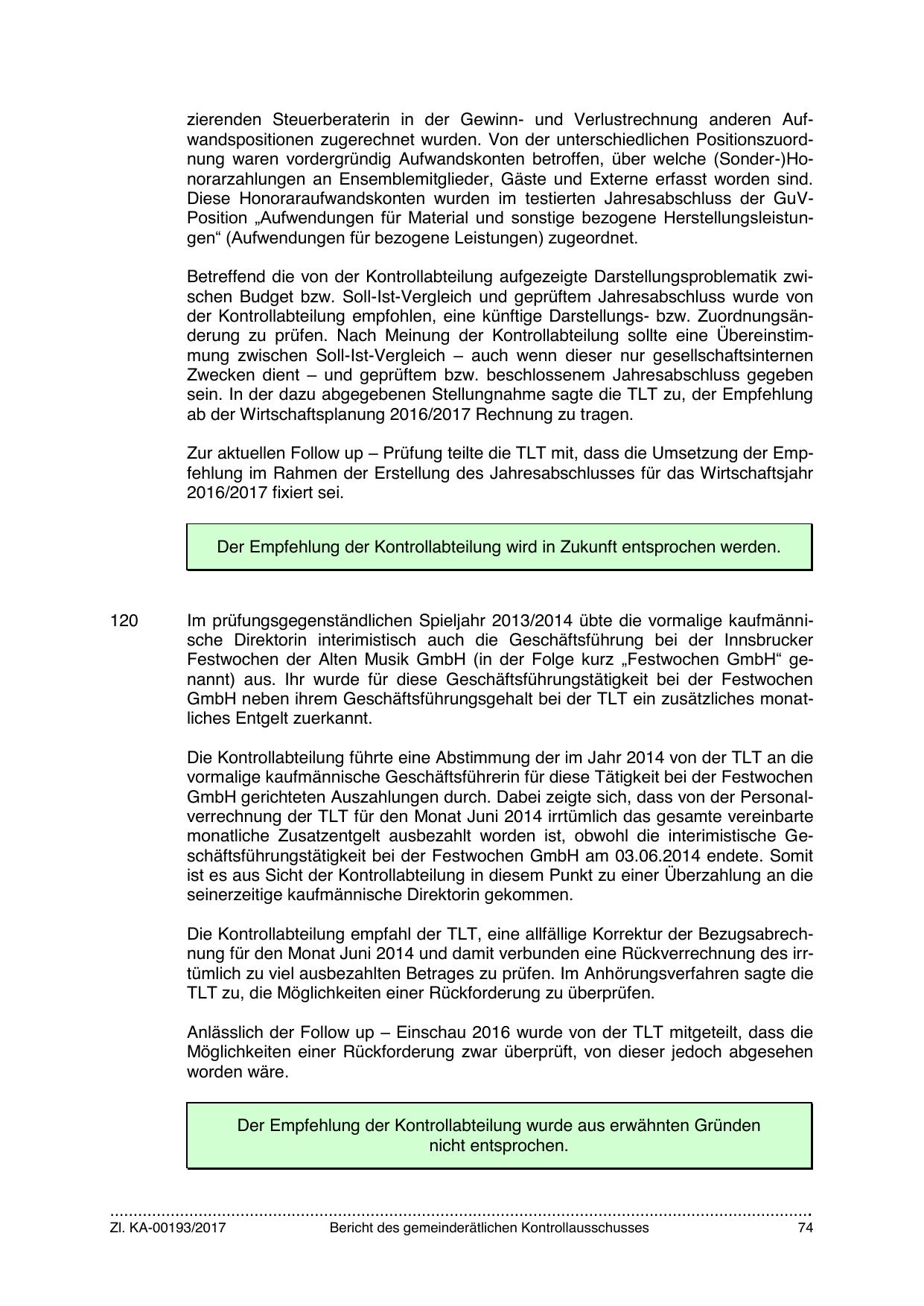 Im prüfungsgegenständlichen Spieljahr 2013/2014 übte die vormalige kaufmännische Direktorin interimistisch auch die Geschäftsführung bei der Innsbrucker
