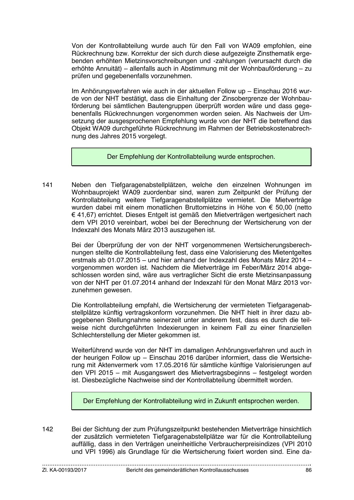 Die Kontrollabteilung empfahl, die Wertsicherung der vermieteten Tiefgaragenabstellplätze künftig vertragskonform vorzunehmen. Die NHT hielt in ihrer dazu abgegebenen Stellungnahme seinerzeit unter anderem fest, dass es durch die teilweise nicht durchgeführten Indexierungen in keinem Fall zu einer finanziellen