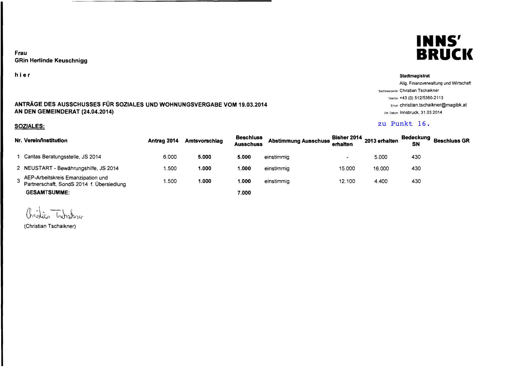 ANTRÄGE DES AUSSCHUSSES FÜR SOZIALES UND WOHNUNGSVERGABE VOM 19.03.2014