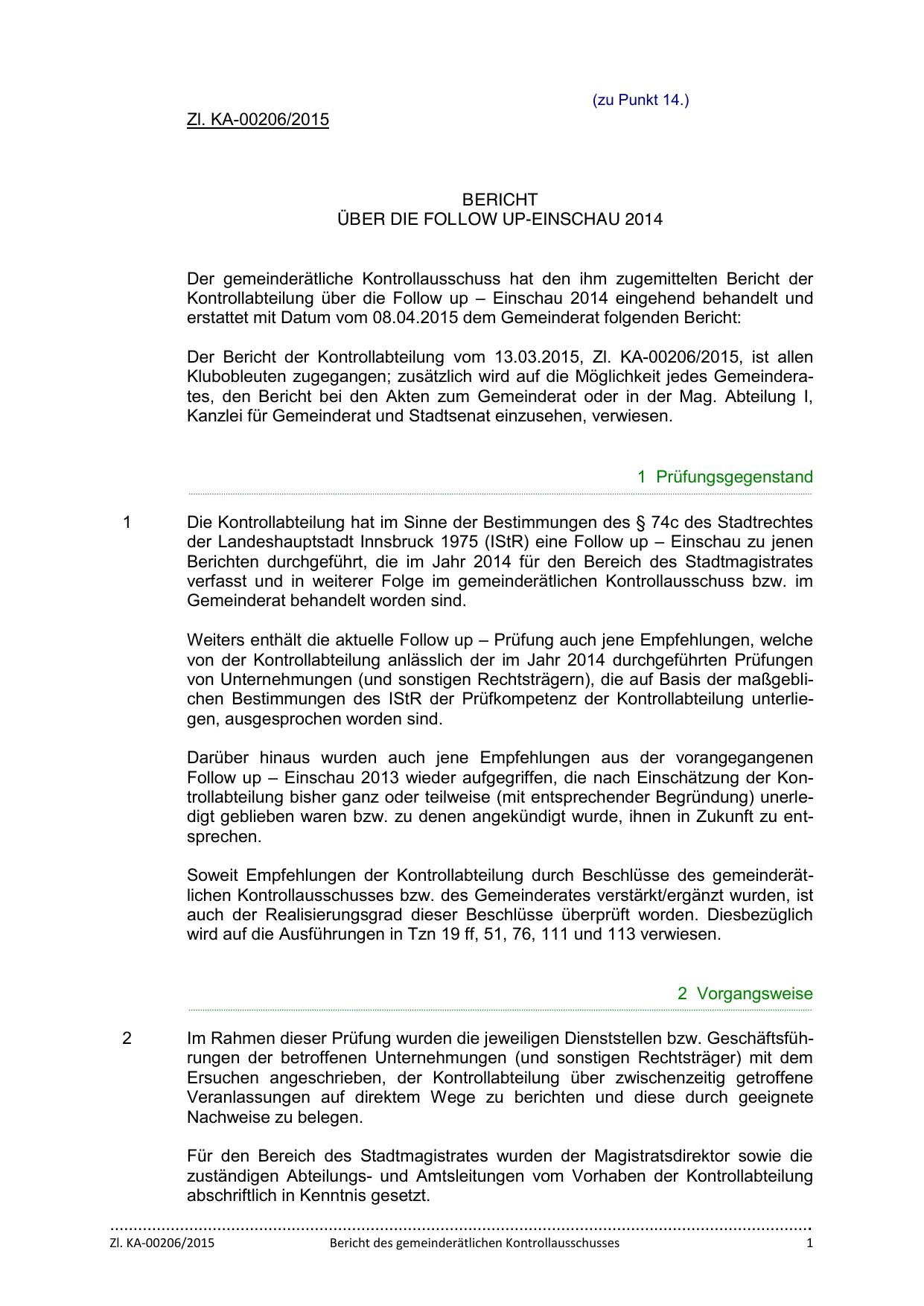 Der Bericht der Kontrollabteilung vom 13.03.2015, Zl. KA-00206/2015, ist allen