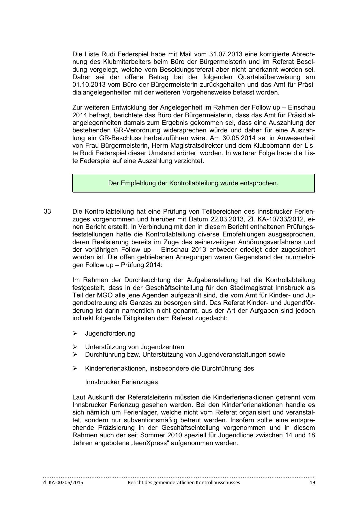 Die Kontrollabteilung hat eine Prüfung von Teilbereichen des Innsbrucker Ferienzuges vorgenommen und hierüber mit Datum 22.03.2013, Zl. KA-10733/2012, einen Bericht erstellt. In Verbindung mit den in diesem Bericht enthaltenen Prüfungsfeststellungen hatte die Kontrollabteilung diverse Empfehlungen ausgesprochen,