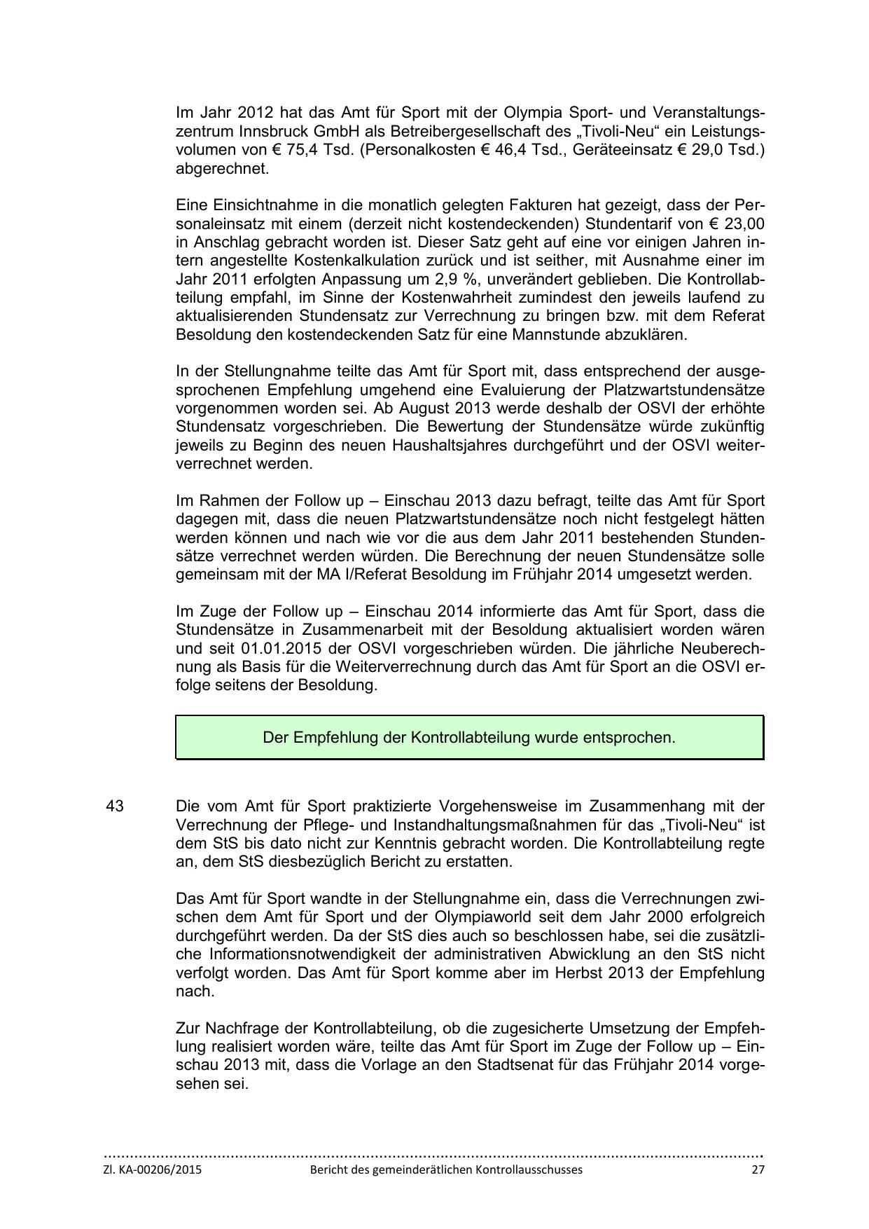 Im Jahr 2012 hat das Amt für Sport mit der Olympia Sport- und Veranstaltungszentrum Innsbruck GmbH als Betreibergesellschaft des „Tivoli-Neu“ ein Leistungsvolumen von € 75,4 Tsd. (Personalkosten € 46,4 Tsd., Geräteeinsatz € 29,0 Tsd.)