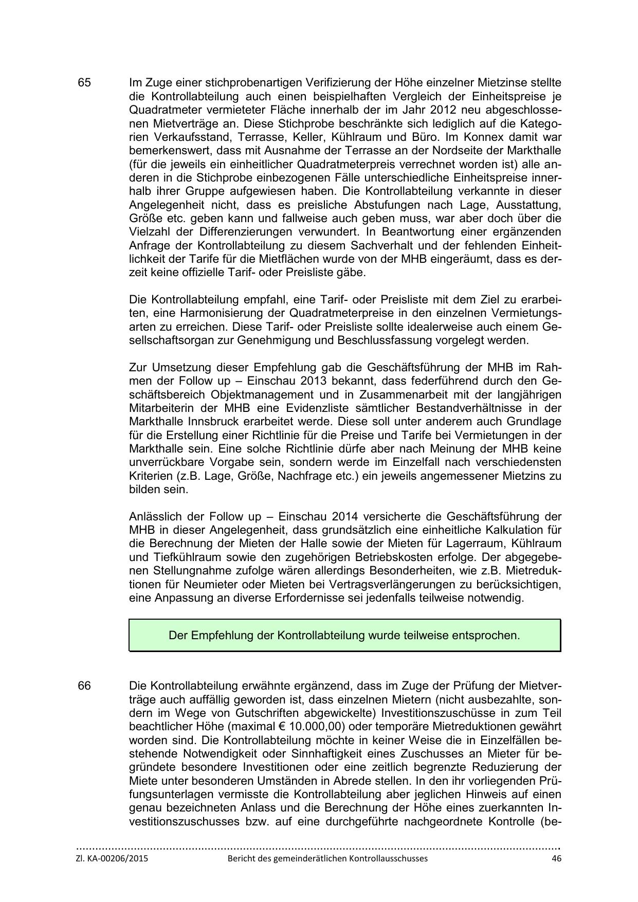 Die Kontrollabteilung empfahl, eine Tarif- oder Preisliste mit dem Ziel zu erarbeiten, eine Harmonisierung der Quadratmeterpreise in den einzelnen Vermietungsarten zu erreichen. Diese Tarif- oder Preisliste sollte idealerweise auch einem Gesellschaftsorgan zur Genehmigung und Beschlussfassung vorgelegt werden.