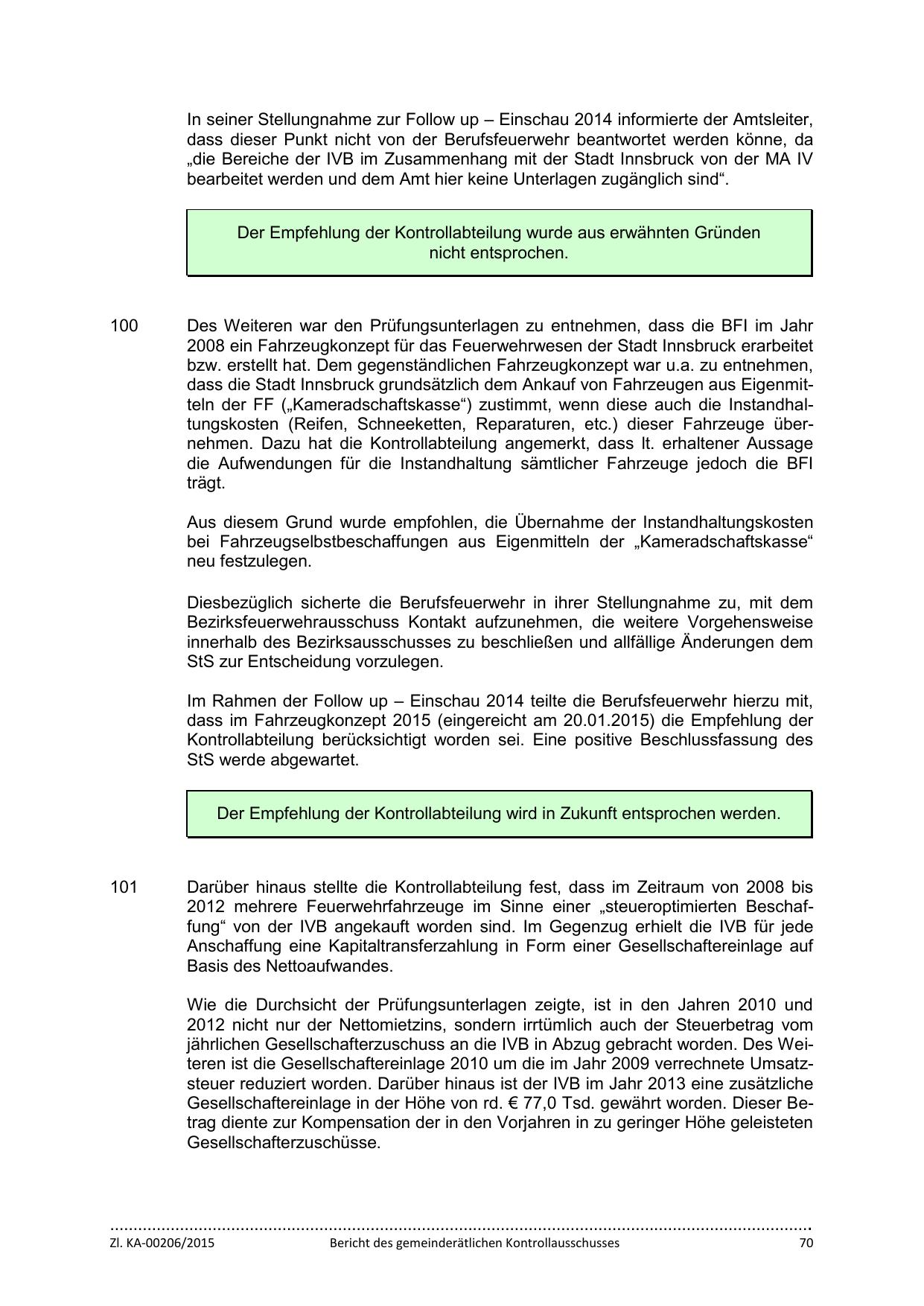 dass die Stadt Innsbruck grundsätzlich dem Ankauf von Fahrzeugen aus Eigenmitteln der FF („Kameradschaftskasse“) zustimmt, wenn diese auch die Instandhaltungskosten (Reifen, Schneeketten, Reparaturen, etc.) dieser Fahrzeuge übernehmen. Dazu hat die Kontrollabteilung angemerkt, dass lt. erhaltener Aussage