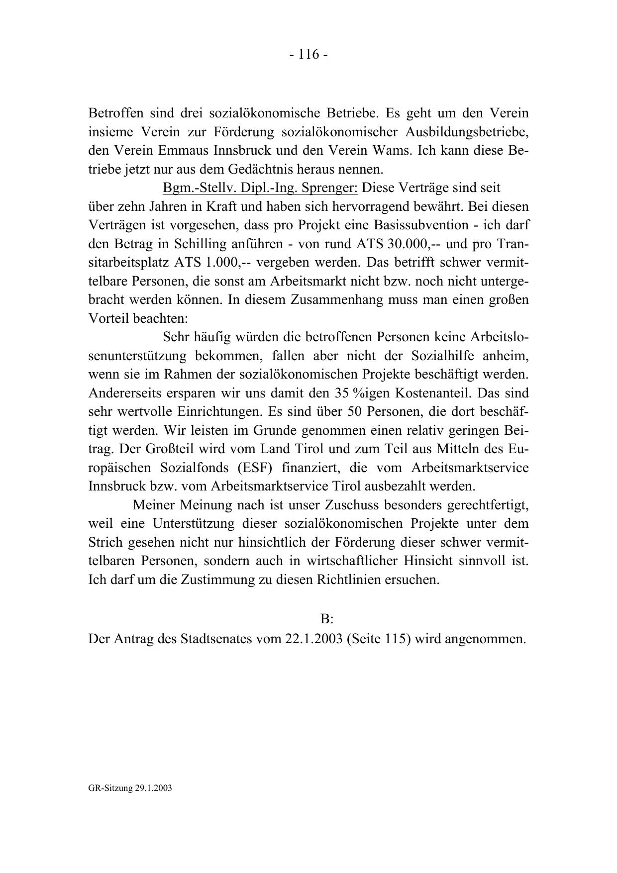 Der Antrag des Stadtsenates vom 22.1.2003 (Seite 115) wird angenommen.