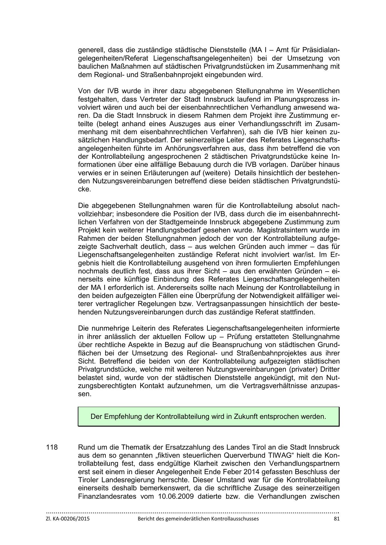 festgehalten, dass Vertreter der Stadt Innsbruck laufend im Planungsprozess involviert wären und auch bei der eisenbahnrechtlichen Verhandlung anwesend waren. Da die Stadt Innsbruck in diesem Rahmen dem Projekt ihre Zustimmung erteilte (belegt anhand eines Auszuges aus einer Verhandlungsschrift im Zusammenhang mit dem eisenbahnrechtlichen Verfahren), sah die IVB hier keinen zusätzlichen Handlungsbedarf. Der seinerzeitige Leiter des Referates Liegenschaftsangelegenheiten führte im Anhörungsverfahren aus, dass ihm betreffend die von