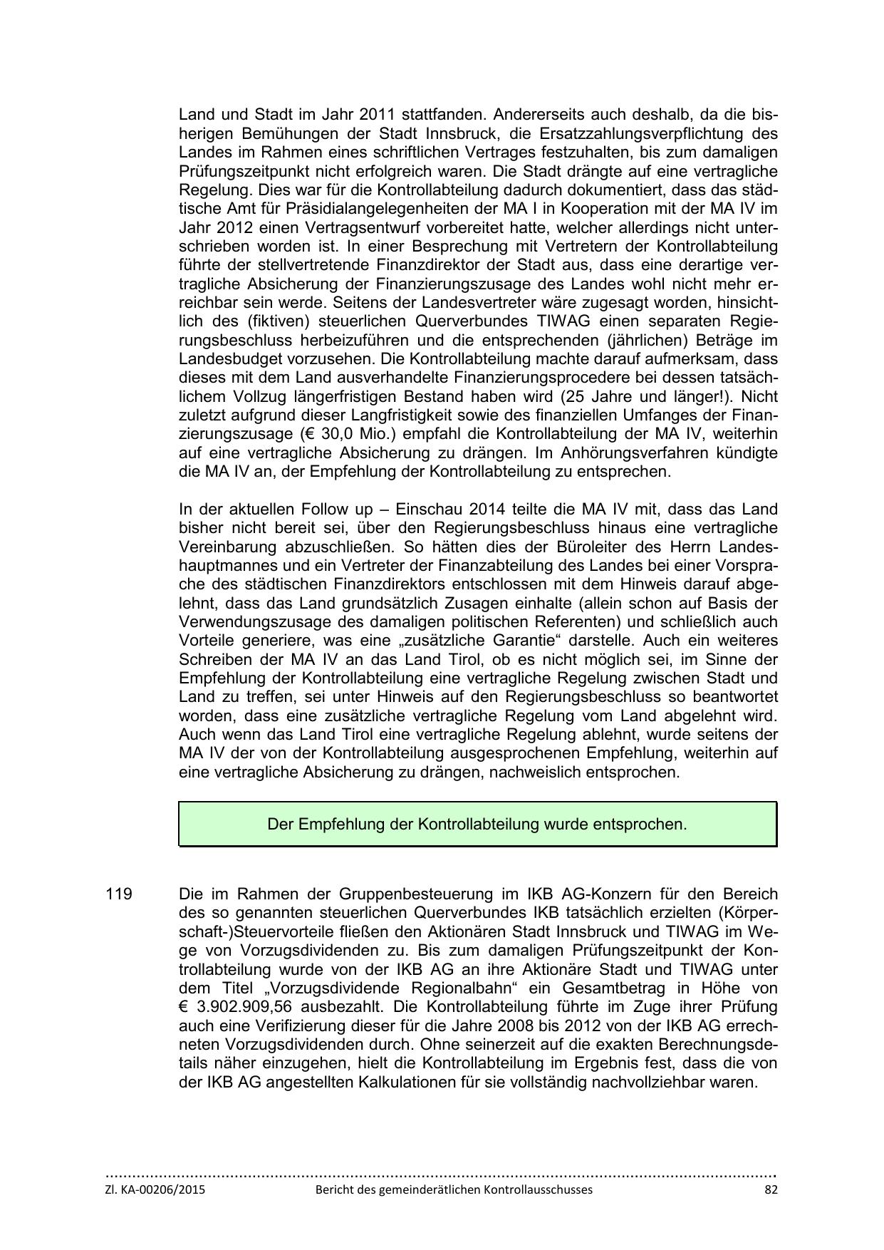 führte der stellvertretende Finanzdirektor der Stadt aus, dass eine derartige vertragliche Absicherung der Finanzierungszusage des Landes wohl nicht mehr erreichbar sein werde. Seitens der Landesvertreter wäre zugesagt worden, hinsichtlich des (fiktiven) steuerlichen Querverbundes TIWAG einen separaten Regierungsbeschluss herbeizuführen und die entsprechenden (jährlichen) Beträge im