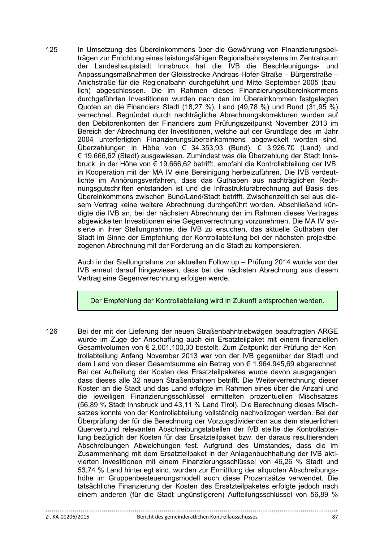 € 19.666,62 (Stadt) ausgewiesen. Zumindest was die Überzahlung der Stadt Innsbruck in der Höhe von € 19.666,62 betrifft, empfahl die Kontrollabteilung der IVB,