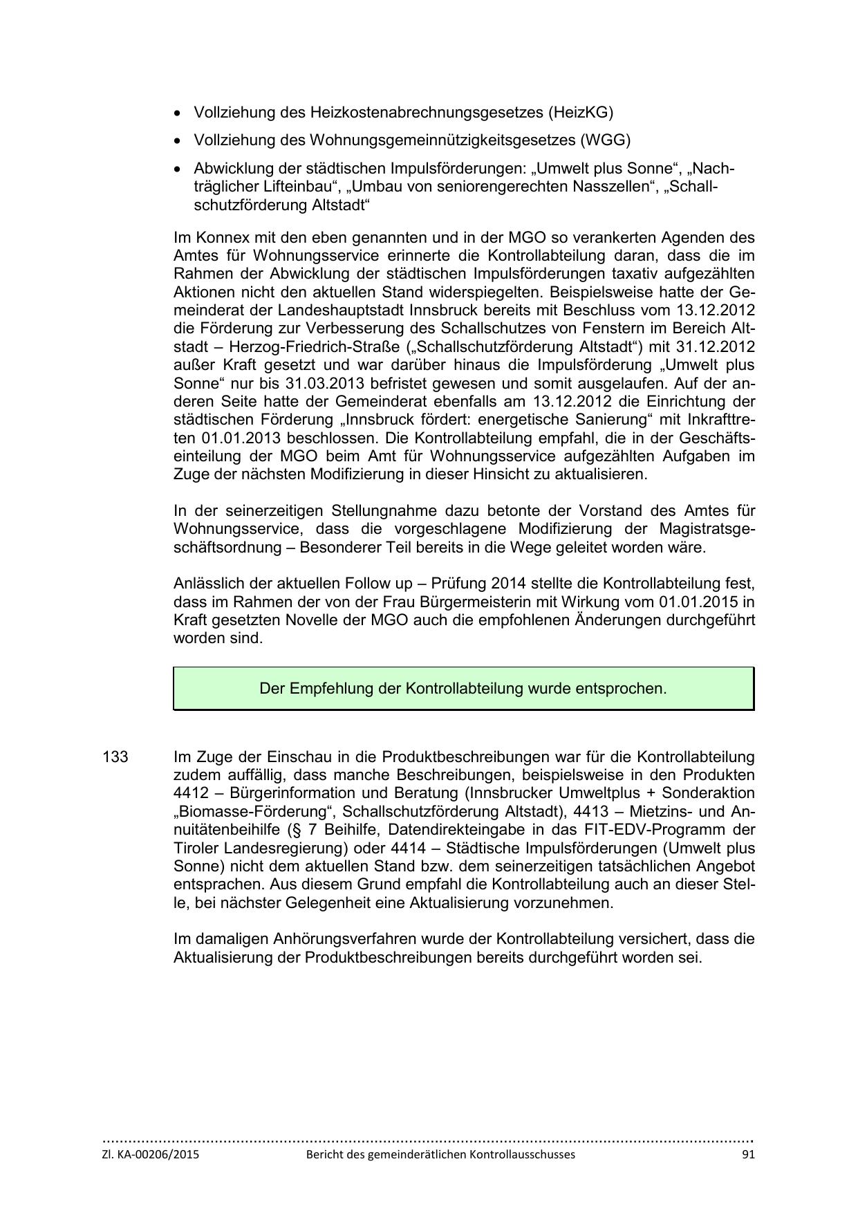 städtischen Förderung „Innsbruck fördert: energetische Sanierung“ mit Inkrafttreten 01.01.2013 beschlossen. Die Kontrollabteilung empfahl, die in der Geschäftseinteilung der MGO beim Amt für Wohnungsservice aufgezählten Aufgaben im