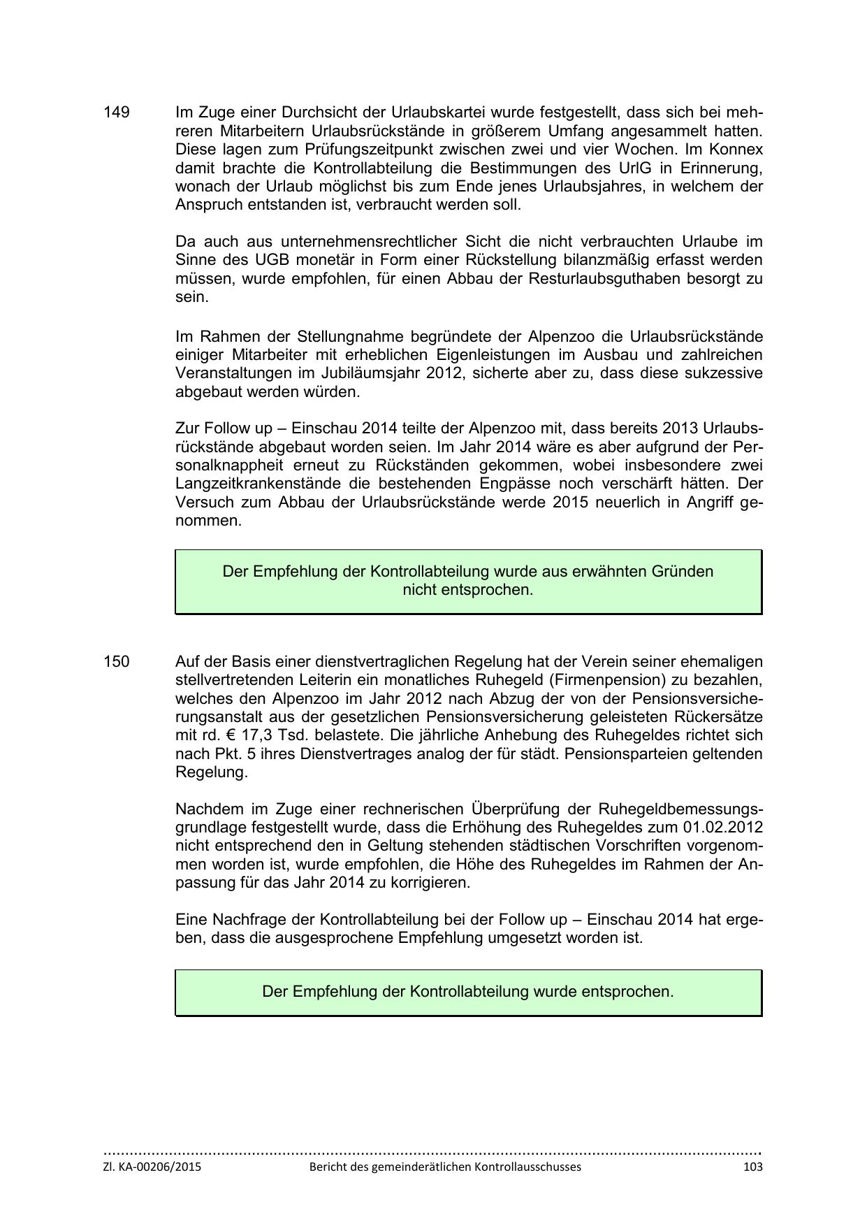 Zur Follow up – Einschau 2014 teilte der Alpenzoo mit, dass bereits 2013 Urlaubsrückstände abgebaut worden seien. Im Jahr 2014 wäre es aber aufgrund der Personalknappheit erneut zu Rückständen gekommen, wobei insbesondere zwei