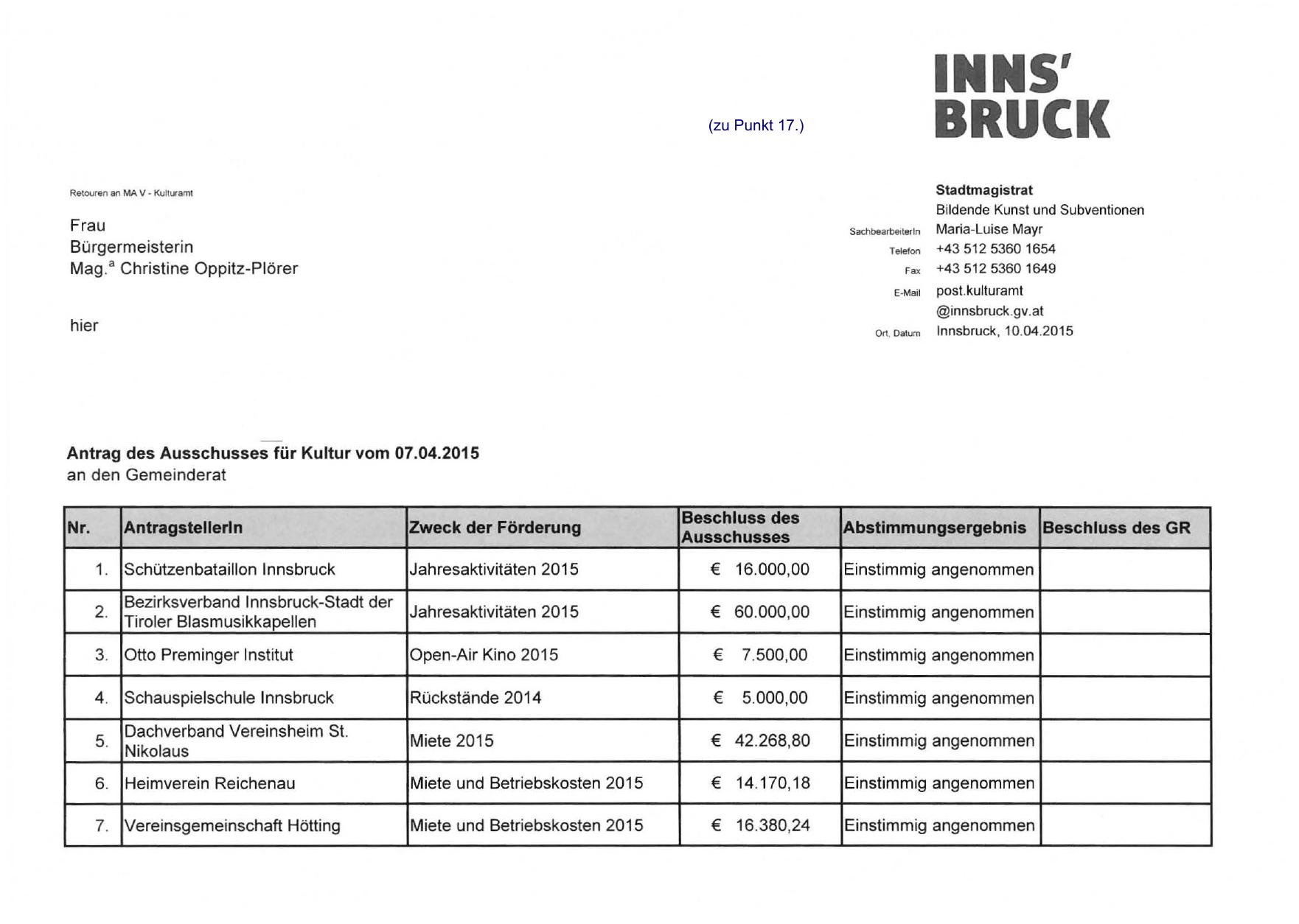 Antrag des Ausschusses für Kultur vom 07.04,2015