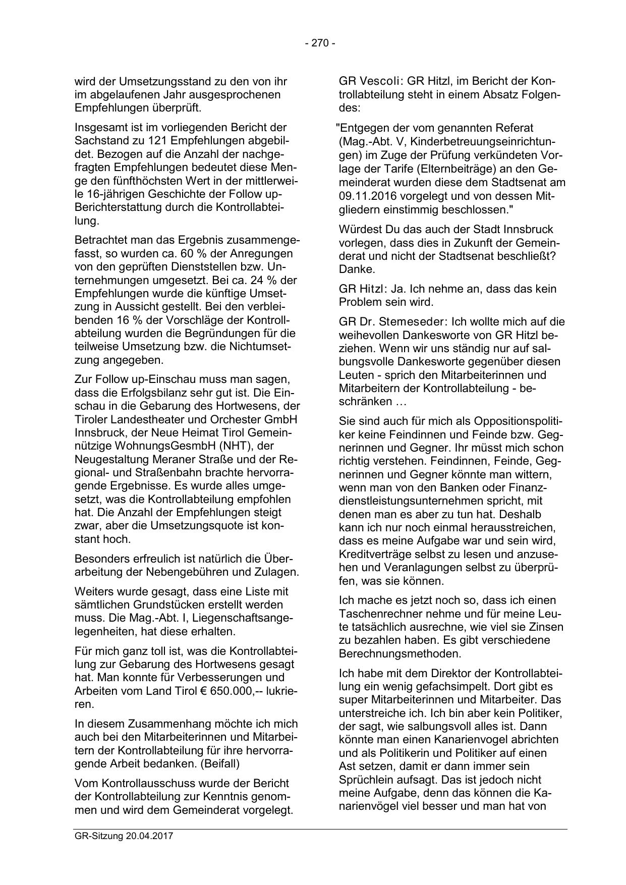 weihevollen Dankesworte von GR Hitzl beziehen. Wenn wir uns ständig nur auf salbungsvolle Dankesworte gegenüber diesen