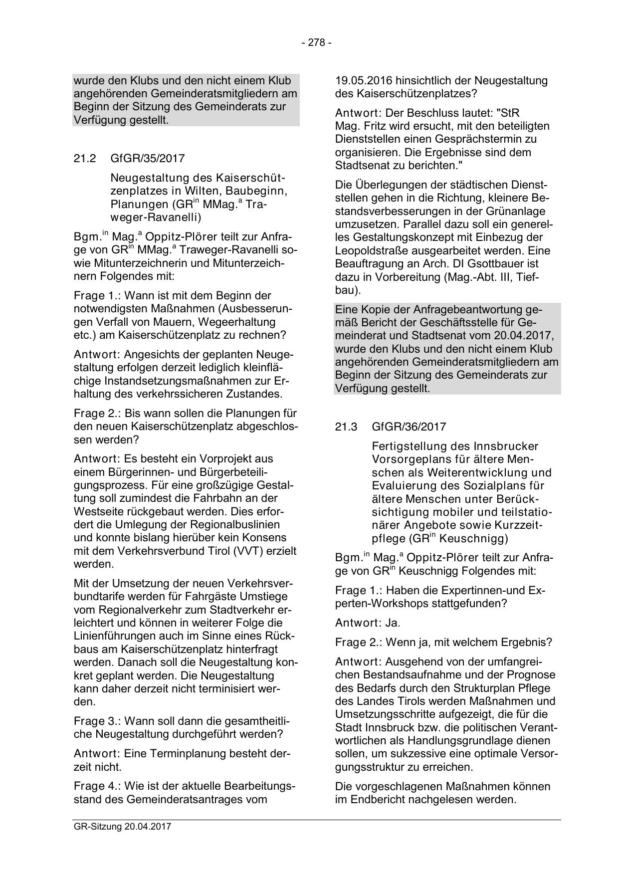 Eine Kopie der Anfragebeantwortung gemäß Bericht der Geschäftsstelle für Gemeinderat und Stadtsenat vom 20.04.2017,