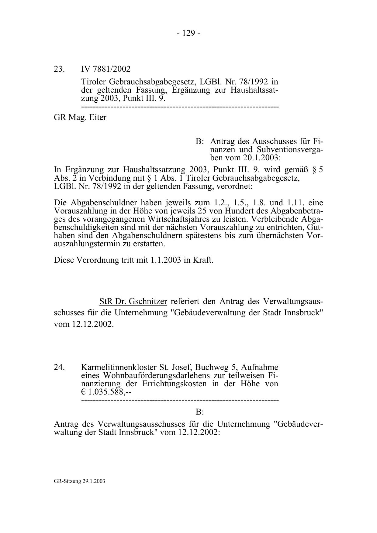 Antrag des Verwaltungsausschusses für die Unternehmung "Gebäudeverwaltung der Stadt Innsbruck" vom 12.12.2002: