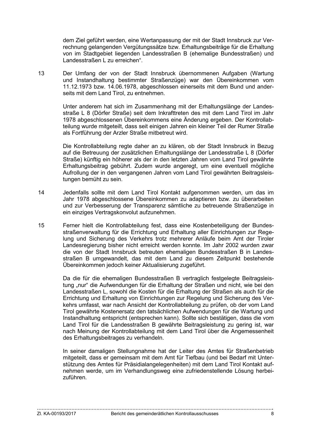 Ferner hielt die Kontrollabteilung fest, dass eine Kostenbeteiligung der Bundesstraßenverwaltung für die Errichtung und Erhaltung aller Einrichtungen zur Regelung und Sicherung des Verkehrs trotz mehrerer Anläufe beim Amt der Tiroler