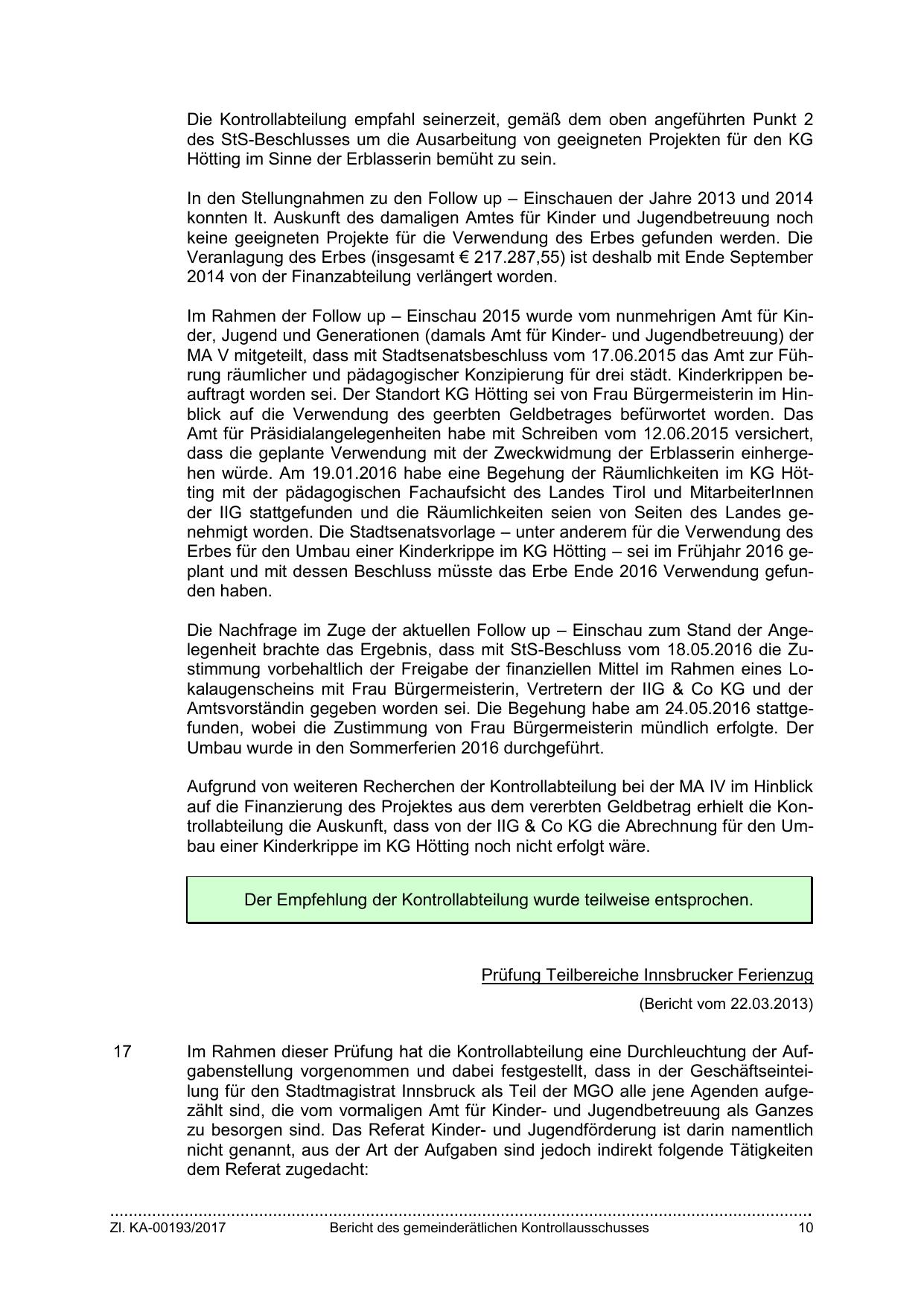 auf die Finanzierung des Projektes aus dem vererbten Geldbetrag erhielt die Kontrollabteilung die Auskunft, dass von der IIG & Co KG die Abrechnung für den Umbau einer Kinderkrippe im KG Hötting noch nicht erfolgt wäre.
