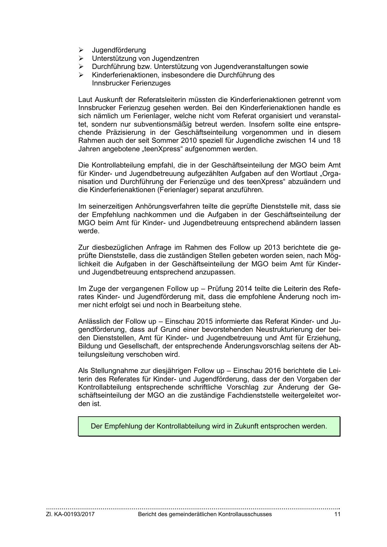 Zur diesbezüglichen Anfrage im Rahmen des Follow up 2013 berichtete die geprüfte Dienststelle, dass die zuständigen Stellen gebeten worden seien, nach Möglichkeit die Aufgaben in der Geschäftseinteilung der MGO beim Amt für Kinderund Jugendbetreuung entsprechend anzupassen.