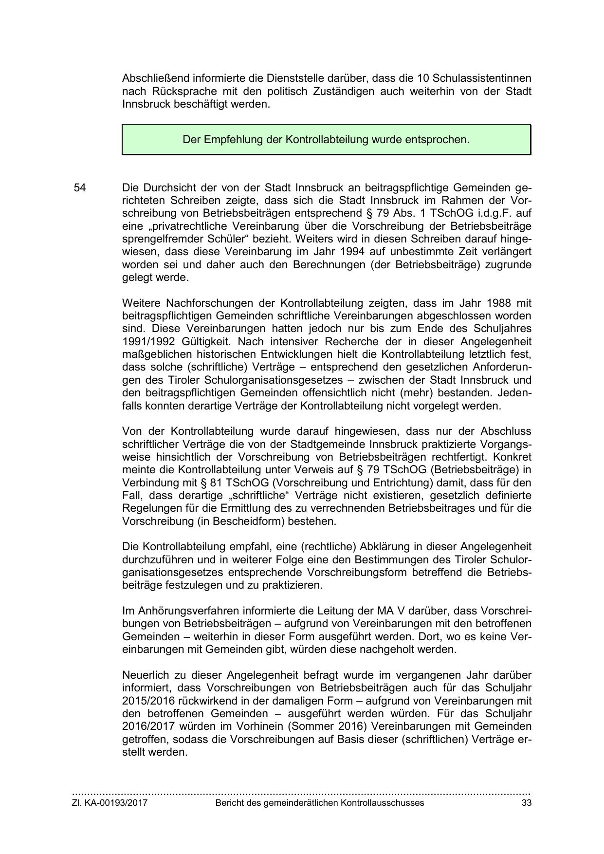 durchzuführen und in weiterer Folge eine den Bestimmungen des Tiroler Schulorganisationsgesetzes entsprechende Vorschreibungsform betreffend die Betriebsbeiträge festzulegen und zu praktizieren.