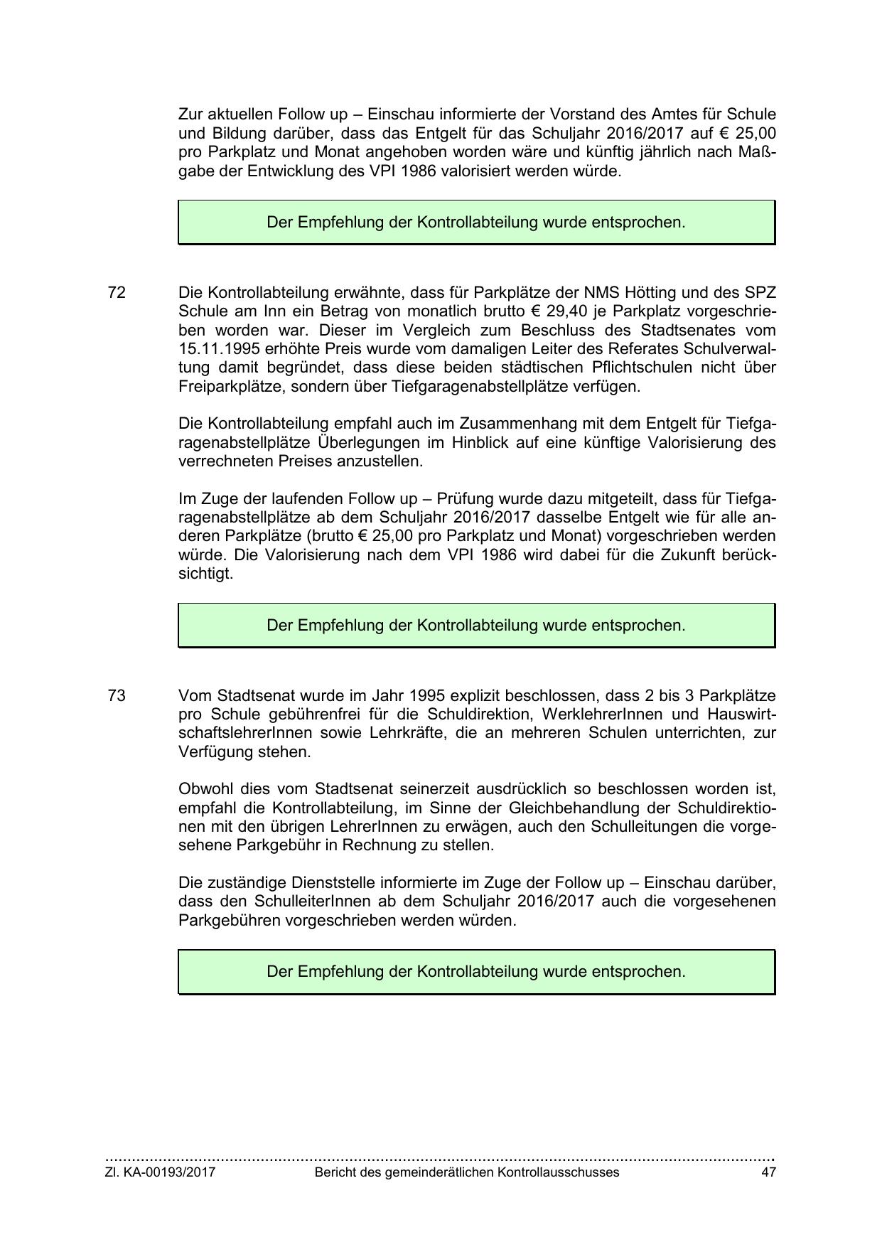 Schule am Inn ein Betrag von monatlich brutto € 29,40 je Parkplatz vorgeschrieben worden war. Dieser im Vergleich zum Beschluss des Stadtsenates vom