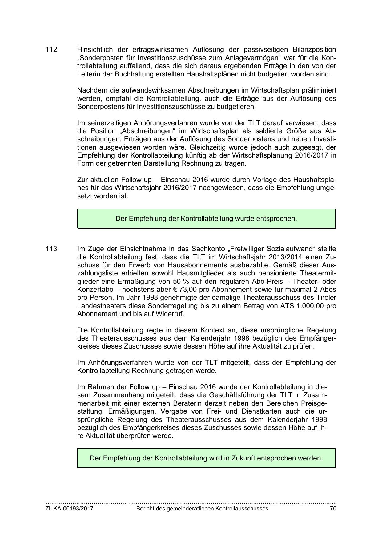 Im Rahmen der Follow up – Einschau 2016 wurde der Kontrollabteilung in diesem Zusammenhang mitgeteilt, dass die Geschäftsführung der TLT in Zusammenarbeit mit einer externen Beraterin derzeit neben den Bereichen Preisgestaltung, Ermäßigungen, Vergabe von Frei- und Dienstkarten auch die ursprüngliche Regelung des Theaterausschusses aus dem Kalenderjahr 1998