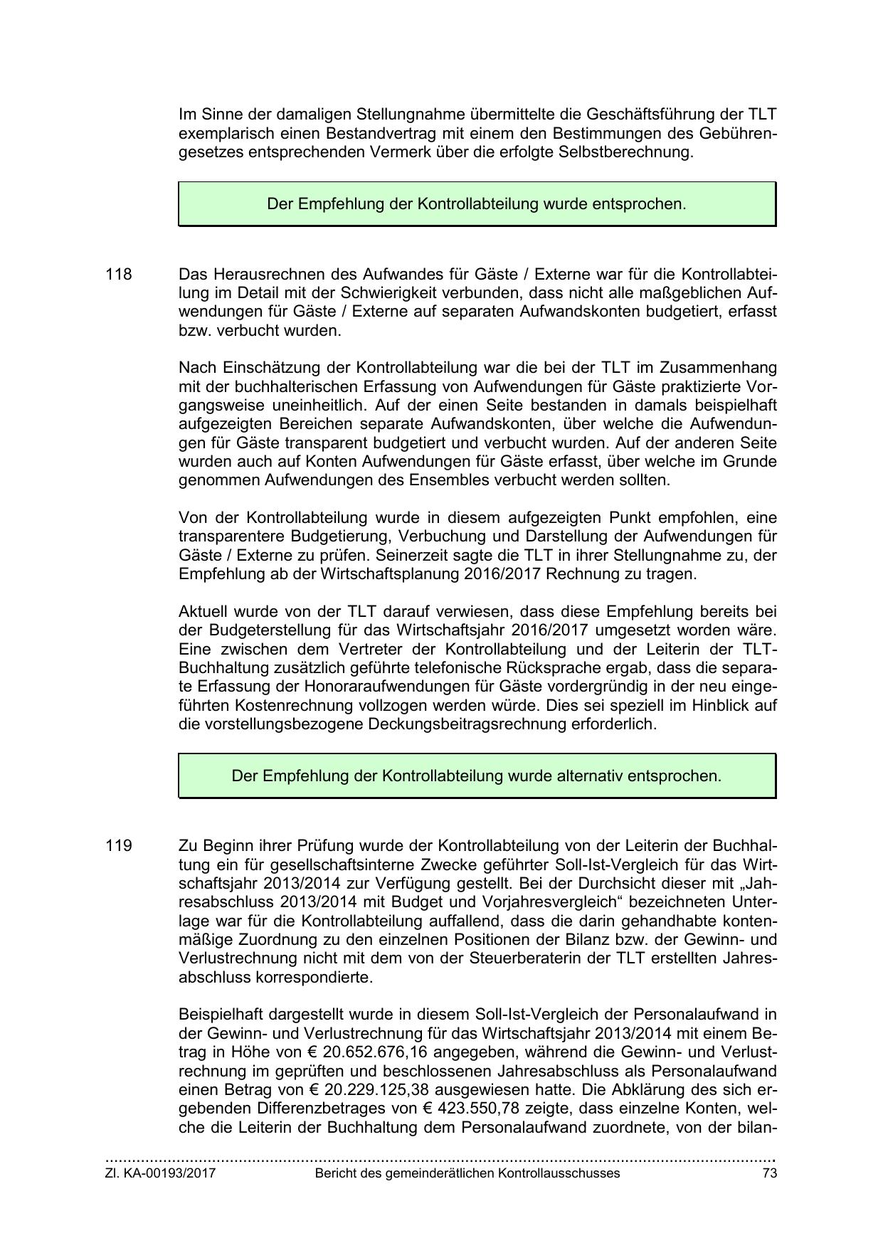 Eine zwischen dem Vertreter der Kontrollabteilung und der Leiterin der TLTBuchhaltung zusätzlich geführte telefonische Rücksprache ergab, dass die separate Erfassung der Honoraraufwendungen für Gäste vordergründig in der neu eingeführten Kostenrechnung vollzogen werden würde. Dies sei speziell im Hinblick auf