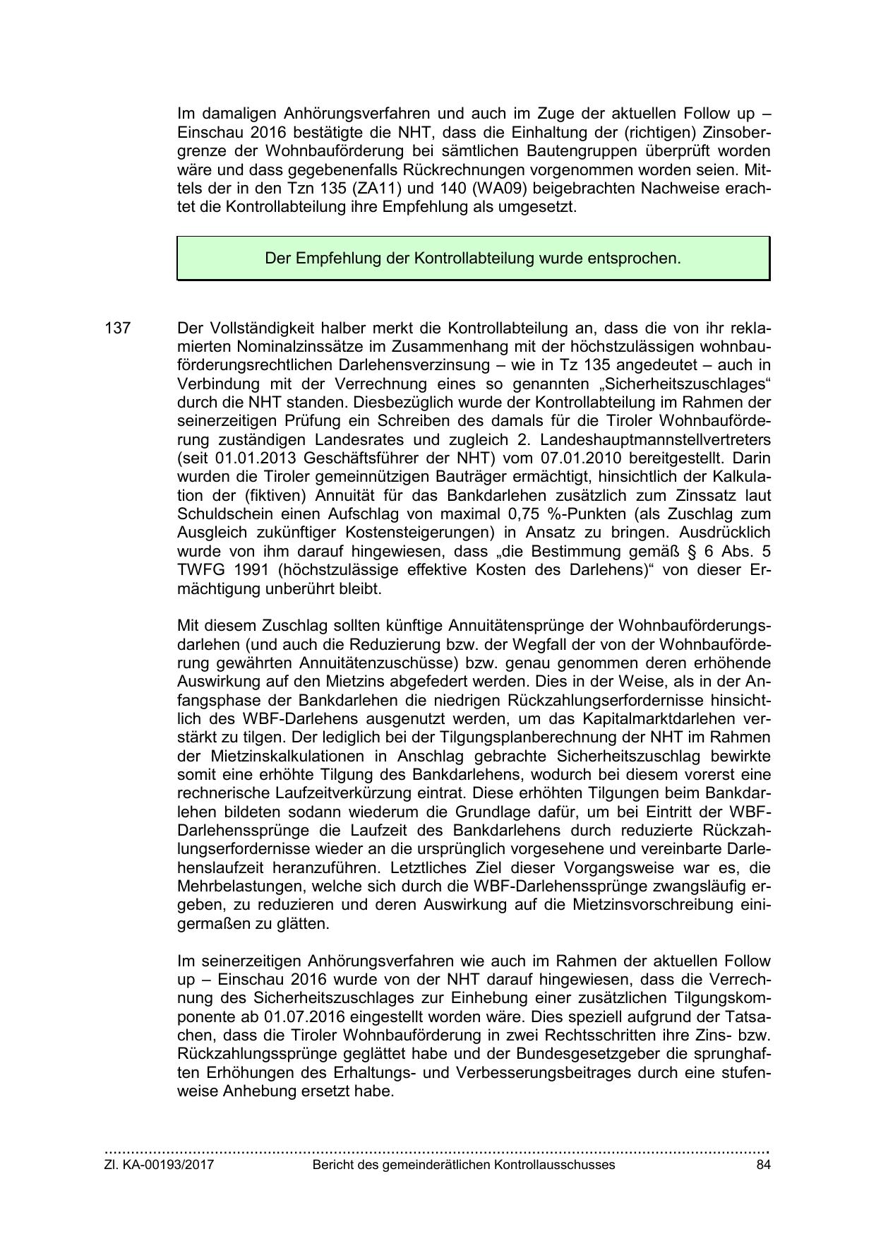 up – Einschau 2016 wurde von der NHT darauf hingewiesen, dass die Verrechnung des Sicherheitszuschlages zur Einhebung einer zusätzlichen Tilgungskomponente ab 01.07.2016 eingestellt worden wäre. Dies speziell aufgrund der Tatsachen, dass die Tiroler Wohnbauförderung in zwei Rechtsschritten ihre Zins- bzw.