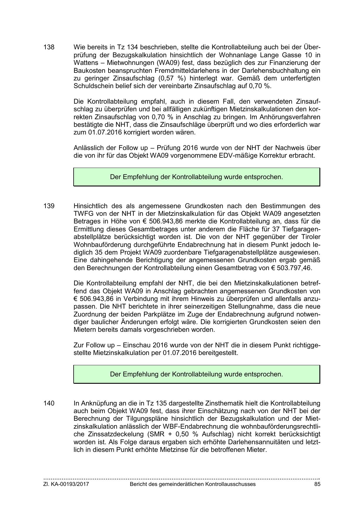 Zur Follow up – Einschau 2016 wurde von der NHT die in diesem Punkt richtiggestellte Mietzinskalkulation per 01.07.2016 bereitgestellt.