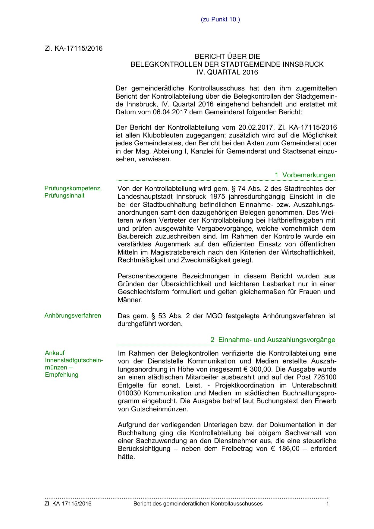 Bericht der Kontrollabteilung über die Belegkontrollen der Stadtgemeinde Innsbruck, IV. Quartal 2016 eingehend behandelt und erstattet mit