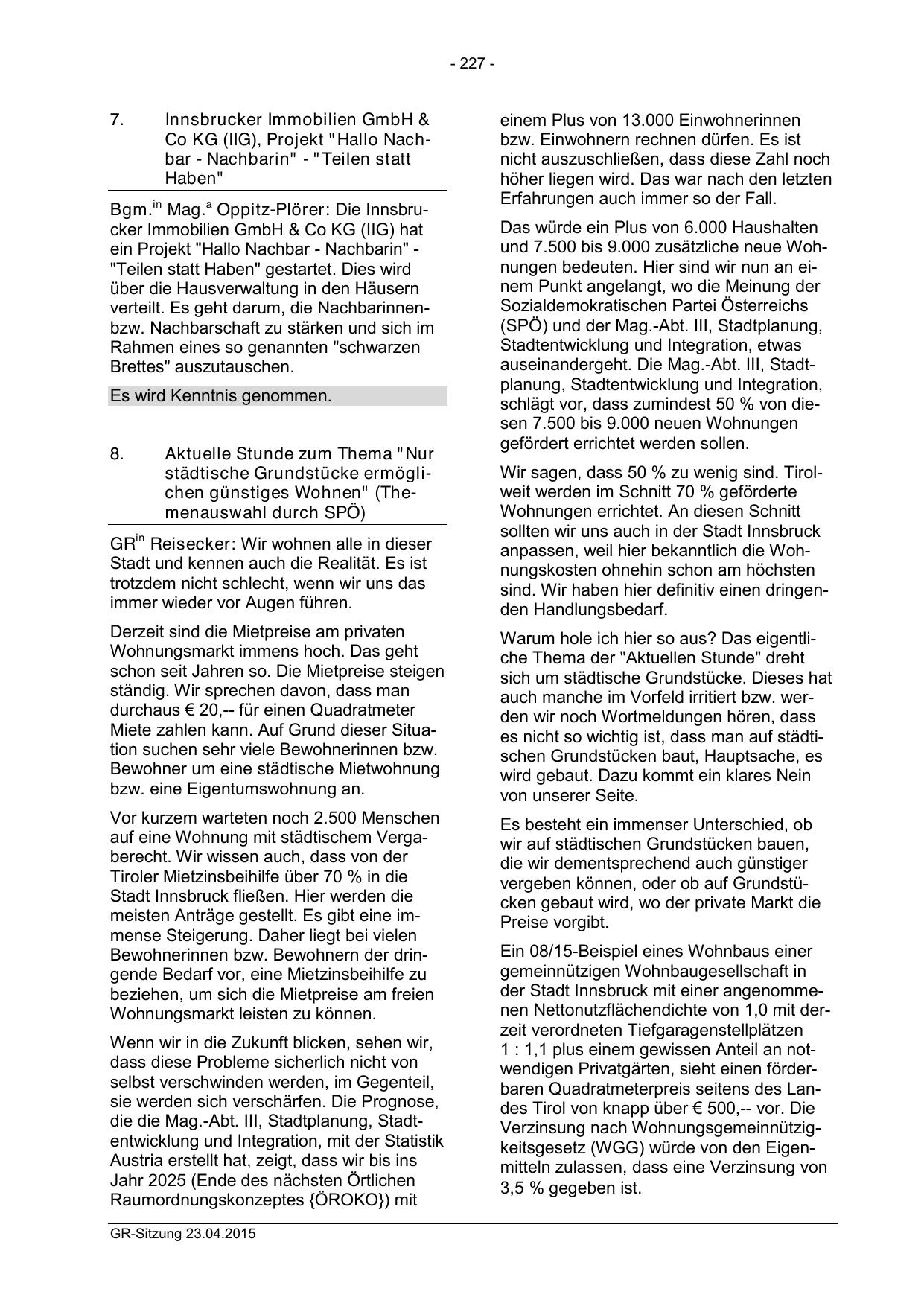 Bgm.in Mag.a Oppitz-Plörer: Die Innsbrucker Immobilien GmbH & Co KG (IIG) hat