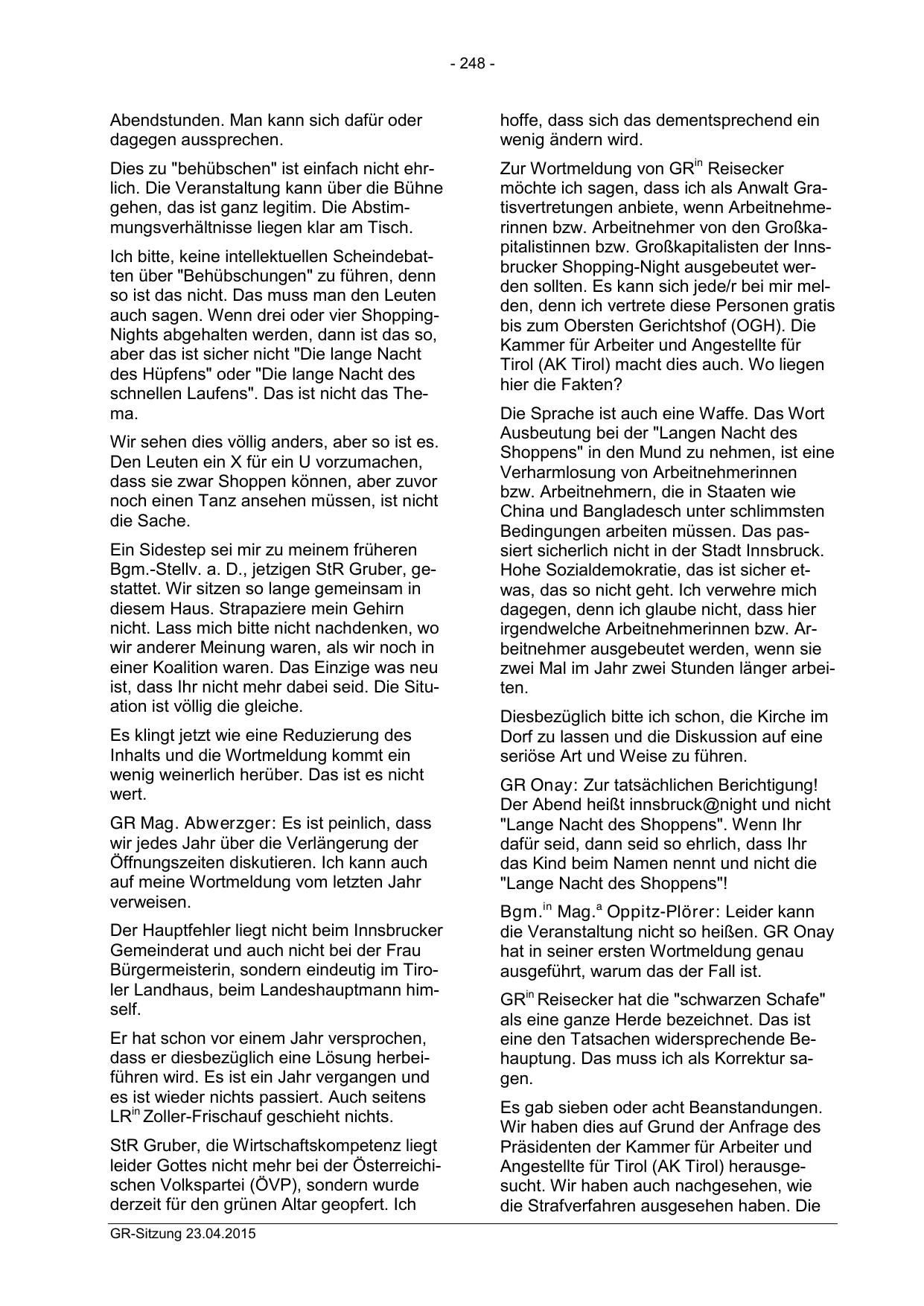 möchte ich sagen, dass ich als Anwalt Gratisvertretungen anbiete, wenn Arbeitnehmerinnen bzw. Arbeitnehmer von den Großkapitalistinnen bzw. Großkapitalisten der Innsbrucker Shopping-Night ausgebeutet werden sollten. Es kann sich jede/r bei mir melden, denn ich vertrete diese Personen gratis