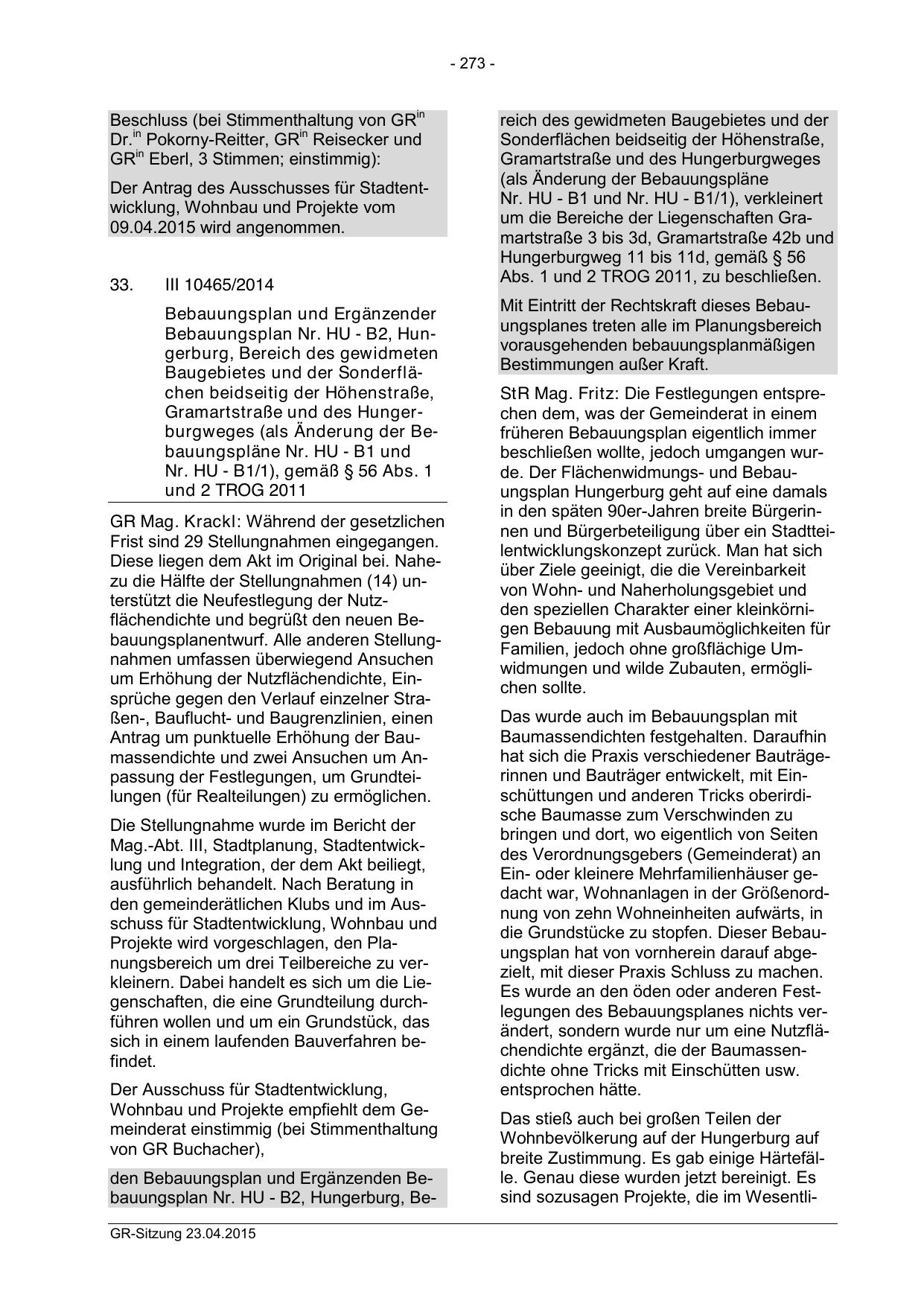 den Bebauungsplan und Ergänzenden Bebauungsplan Nr. HU - B2, Hungerburg, BeGR-Sitzung 23.04.2015