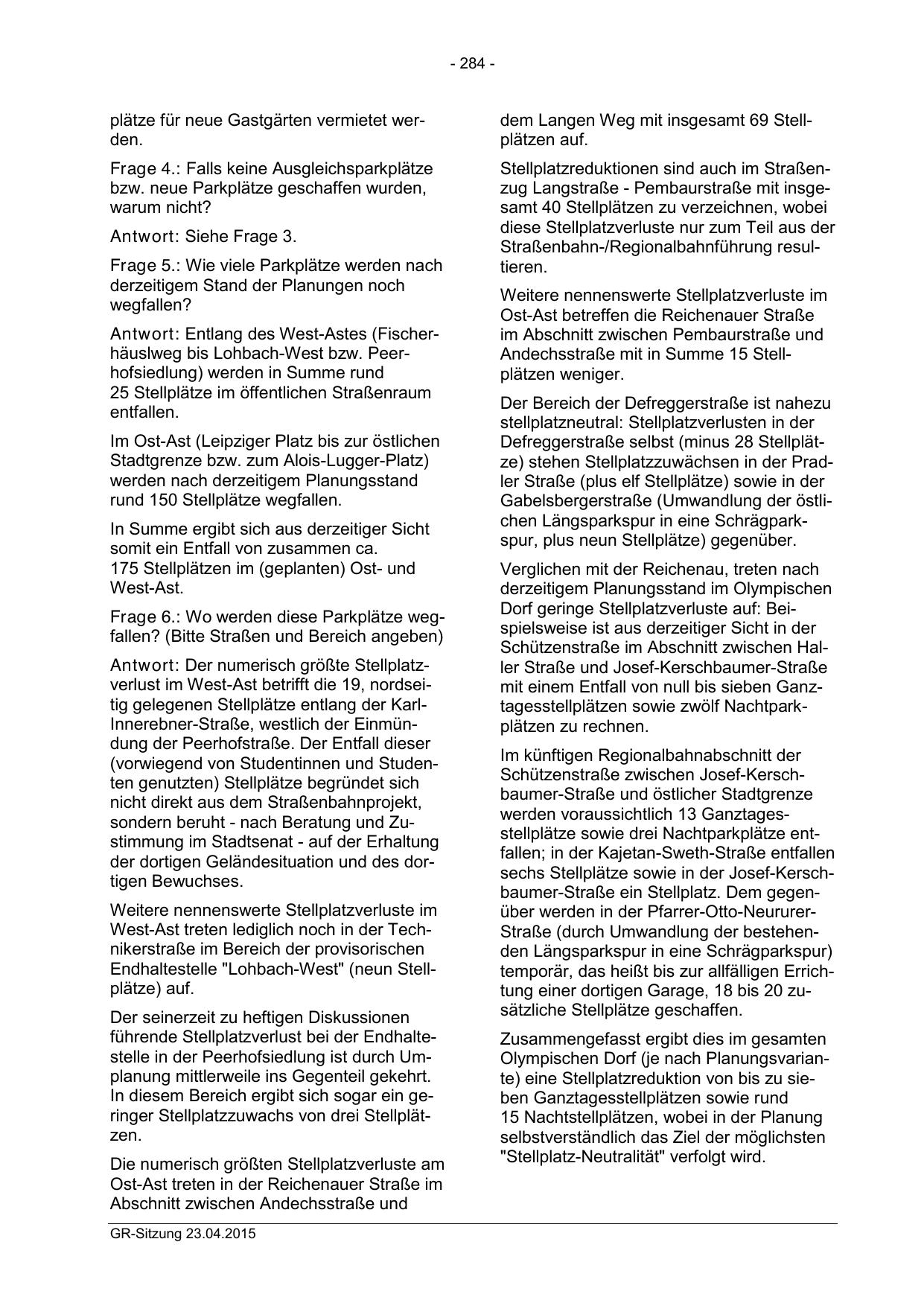 Defreggerstraße selbst (minus 28 Stellplätze) stehen Stellplatzzuwächsen in der Pradler Straße (plus elf Stellplätze) sowie in der