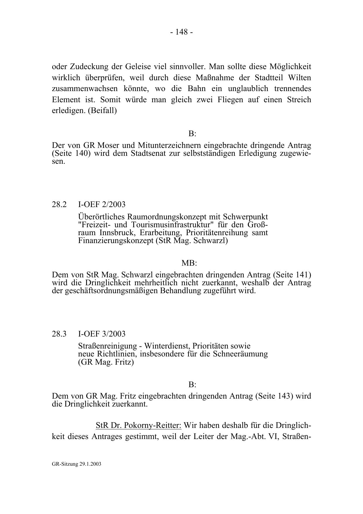 StR Dr. Pokorny-Reitter: Wir haben deshalb für die Dringlichkeit dieses Antrages gestimmt, weil der Leiter der Mag.-Abt. VI, StraßenGR-Sitzung 29.1.2003