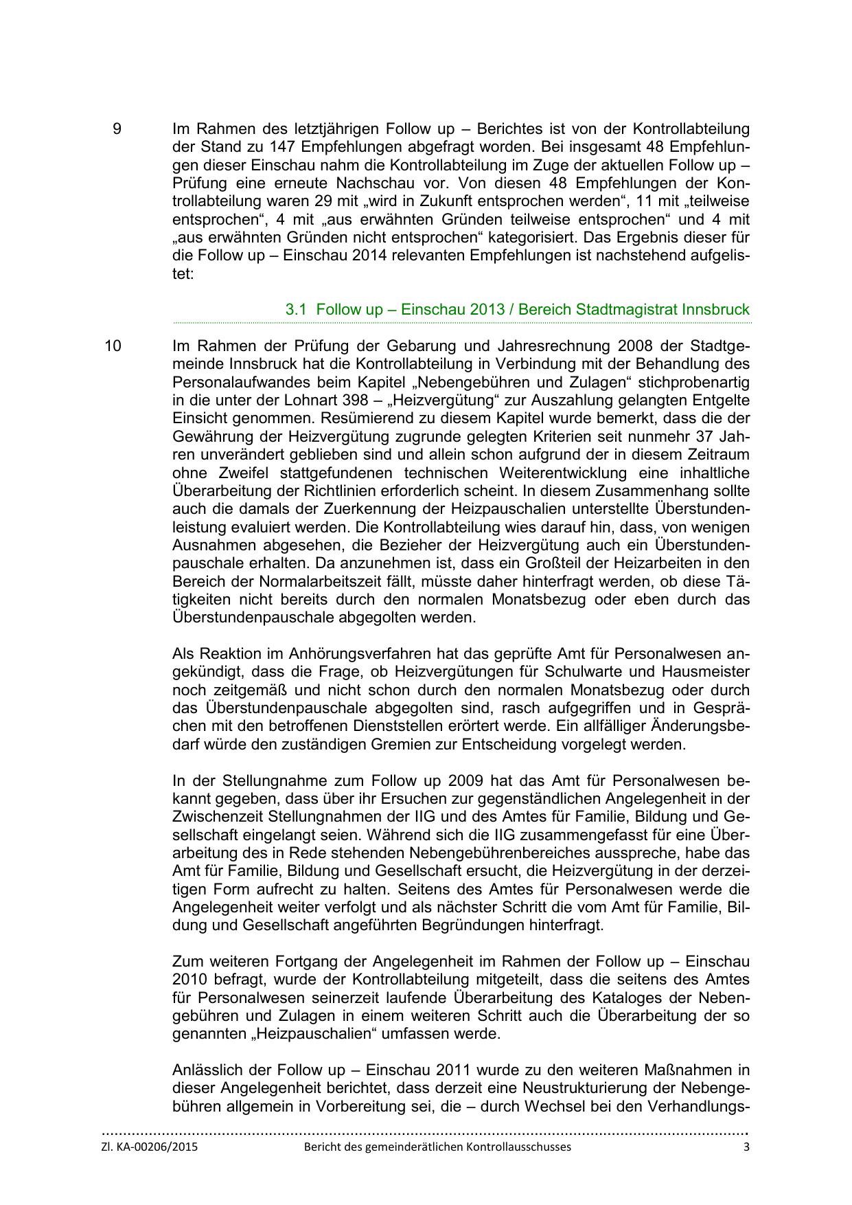 3.1 Follow up – Einschau 2013 / Bereich Stadtmagistrat Innsbruck