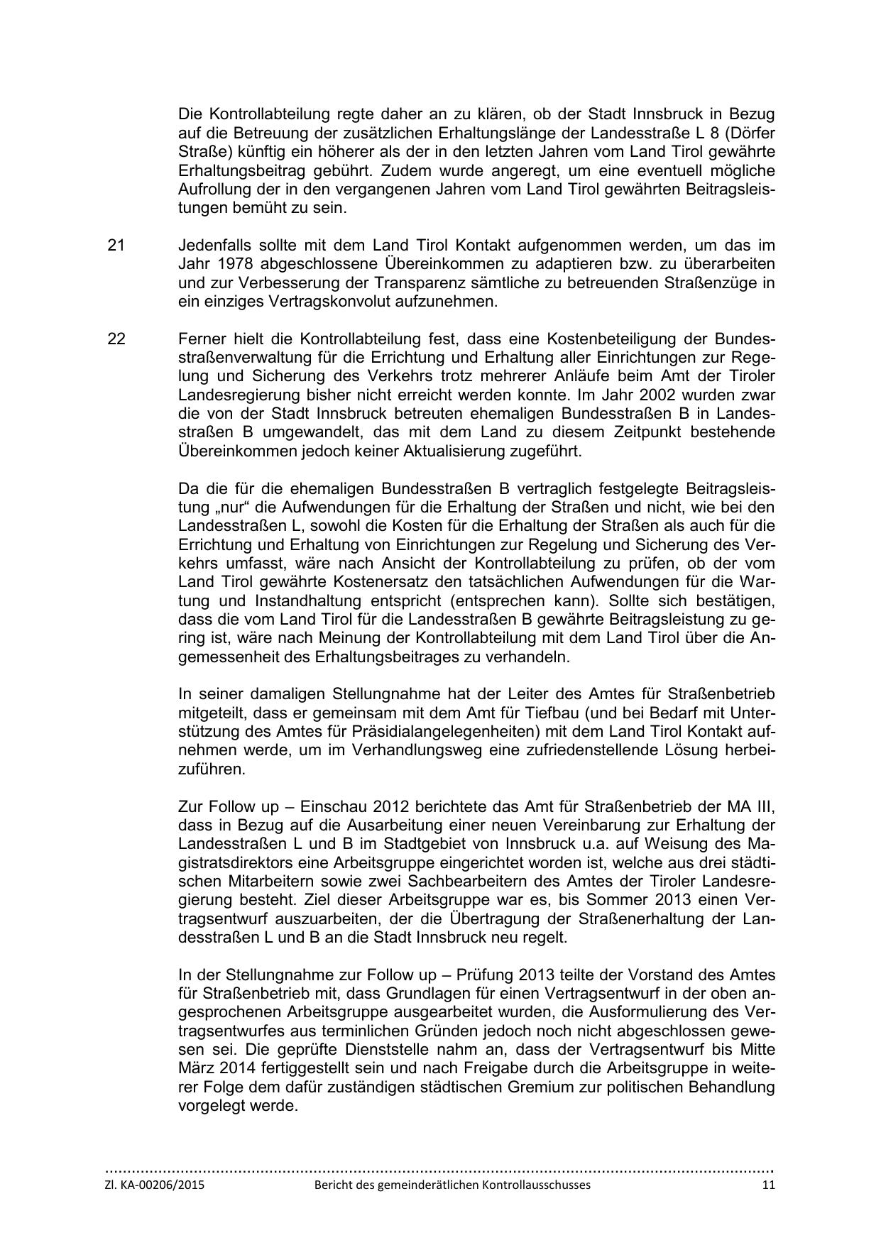 dass die vom Land Tirol für die Landesstraßen B gewährte Beitragsleistung zu gering ist, wäre nach Meinung der Kontrollabteilung mit dem Land Tirol über die Angemessenheit des Erhaltungsbeitrages zu verhandeln.