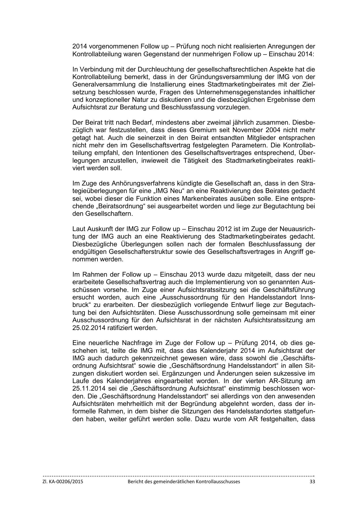 Eine neuerliche Nachfrage im Zuge der Follow up – Prüfung 2014, ob dies geschehen ist, teilte die IMG mit, dass das Kalenderjahr 2014 im Aufsichtsrat der