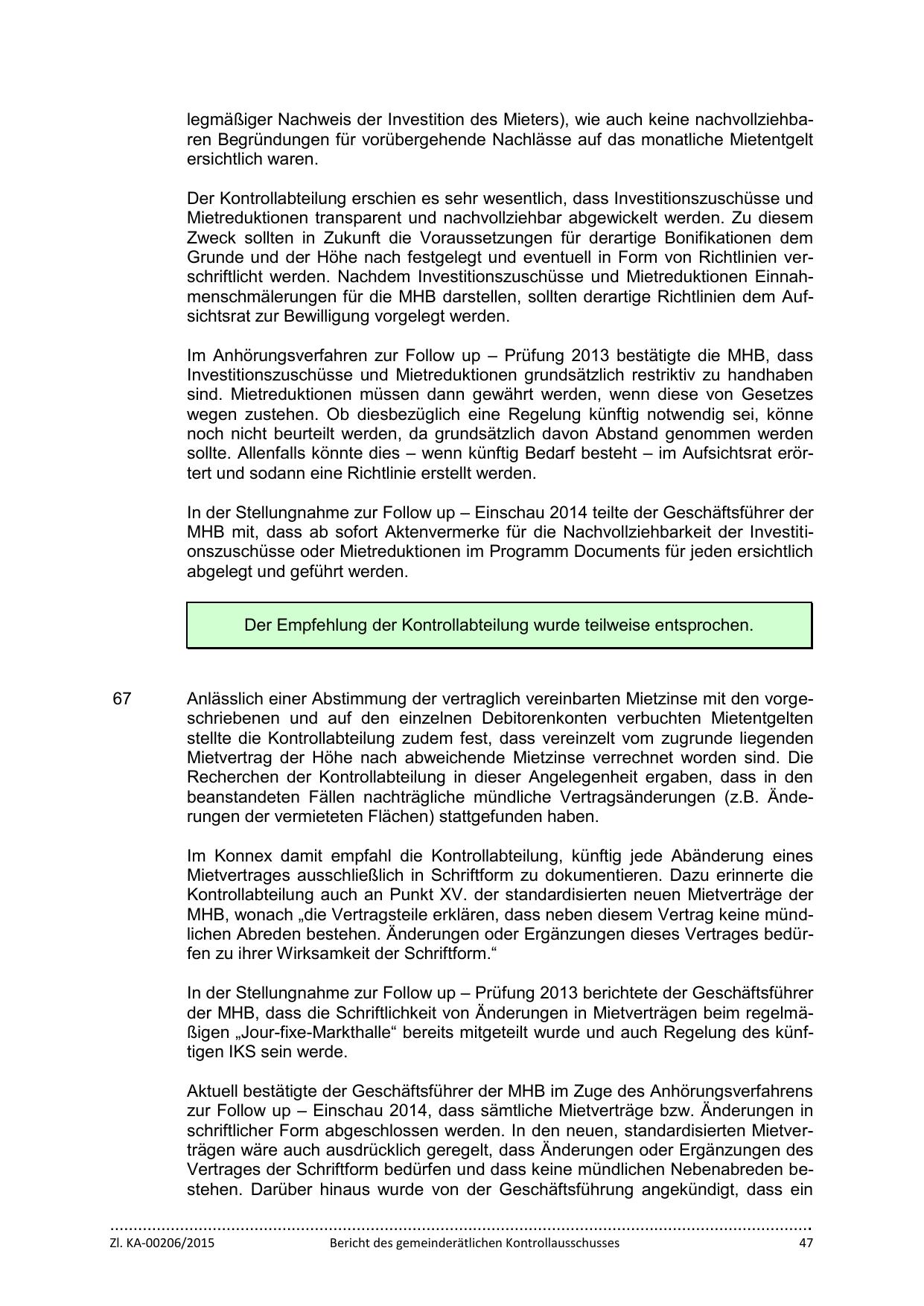 Grunde und der Höhe nach festgelegt und eventuell in Form von Richtlinien verschriftlicht werden. Nachdem Investitionszuschüsse und Mietreduktionen Einnahmenschmälerungen für die MHB darstellen, sollten derartige Richtlinien dem Aufsichtsrat zur Bewilligung vorgelegt werden.