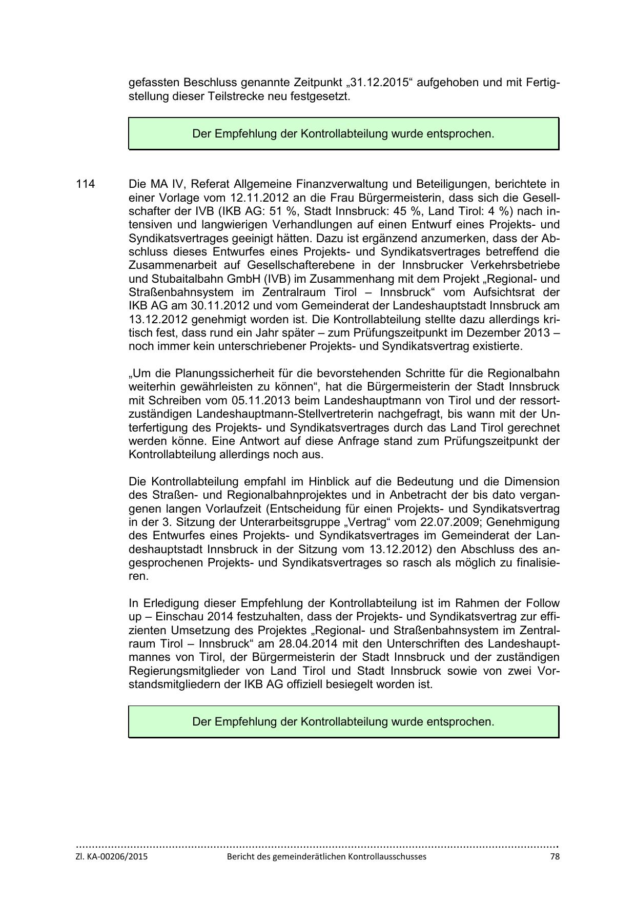 up – Einschau 2014 festzuhalten, dass der Projekts- und Syndikatsvertrag zur effizienten Umsetzung des Projektes „Regional- und Straßenbahnsystem im Zentralraum Tirol – Innsbruck“ am 28.04.2014 mit den Unterschriften des Landeshauptmannes von Tirol, der Bürgermeisterin der Stadt Innsbruck und der zuständigen