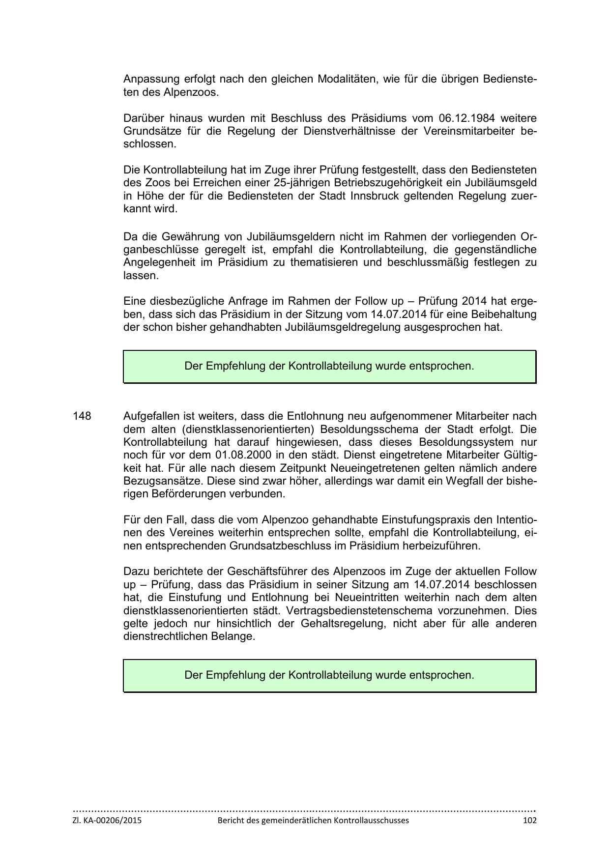 Da die Gewährung von Jubiläumsgeldern nicht im Rahmen der vorliegenden Organbeschlüsse geregelt ist, empfahl die Kontrollabteilung, die gegenständliche