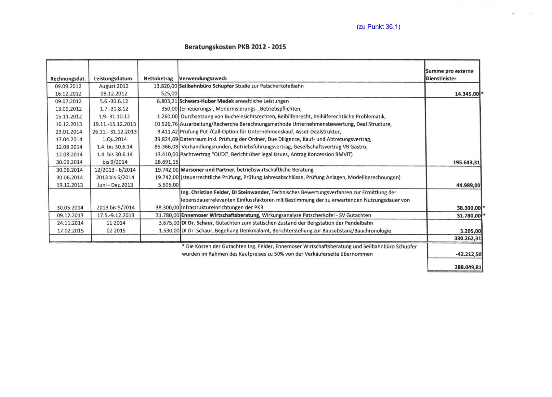 • Die Kosten der Gutachten Ing. Felder, Ennemoser Wirtschaftsberatung und Seilbahnbüro Schupfer