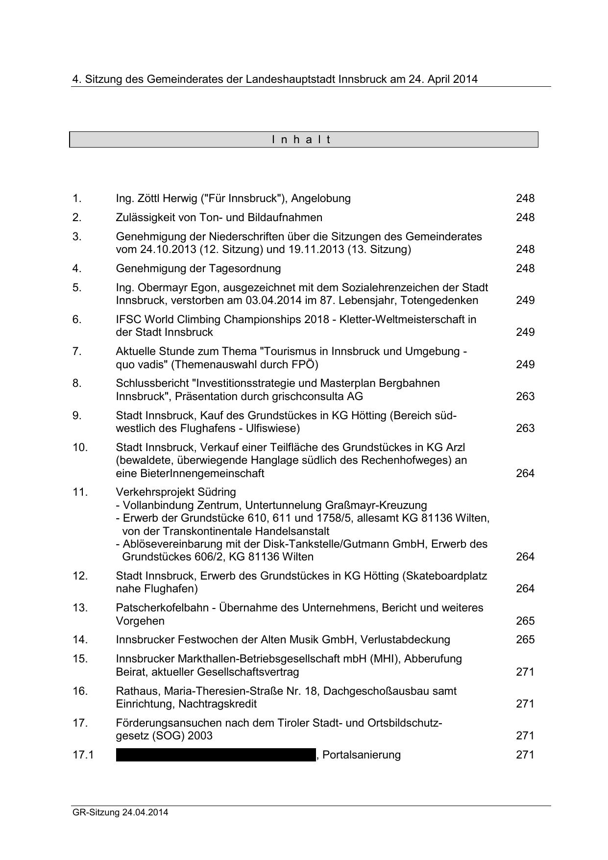 4. Sitzung des Gemeinderates der Landeshauptstadt Innsbruck am 24. April 2014