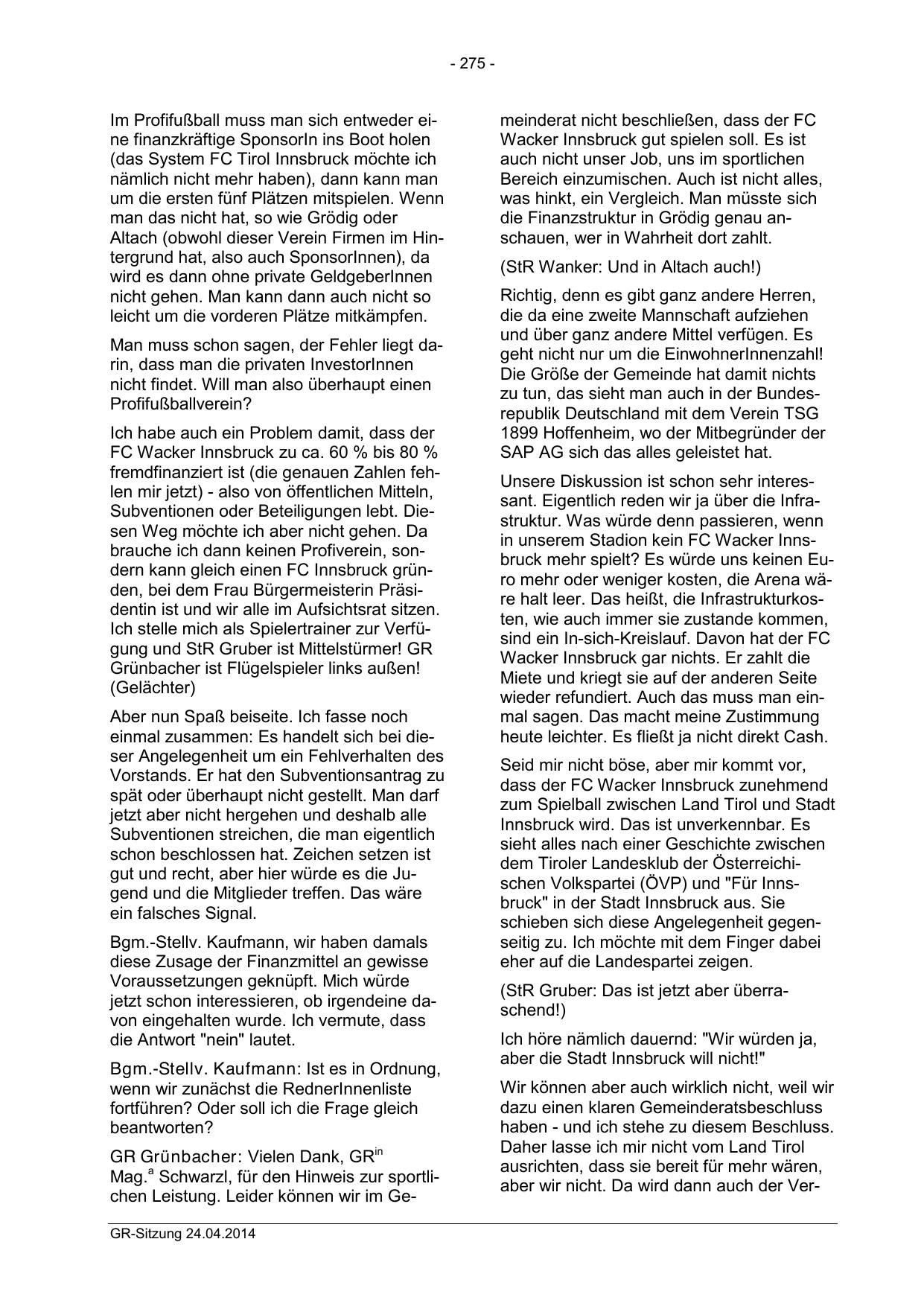in unserem Stadion kein FC Wacker Innsbruck mehr spielt? Es würde uns keinen Euro mehr oder weniger kosten, die Arena wäre halt leer. Das heißt, die Infrastrukturkosten, wie auch immer sie zustande kommen,