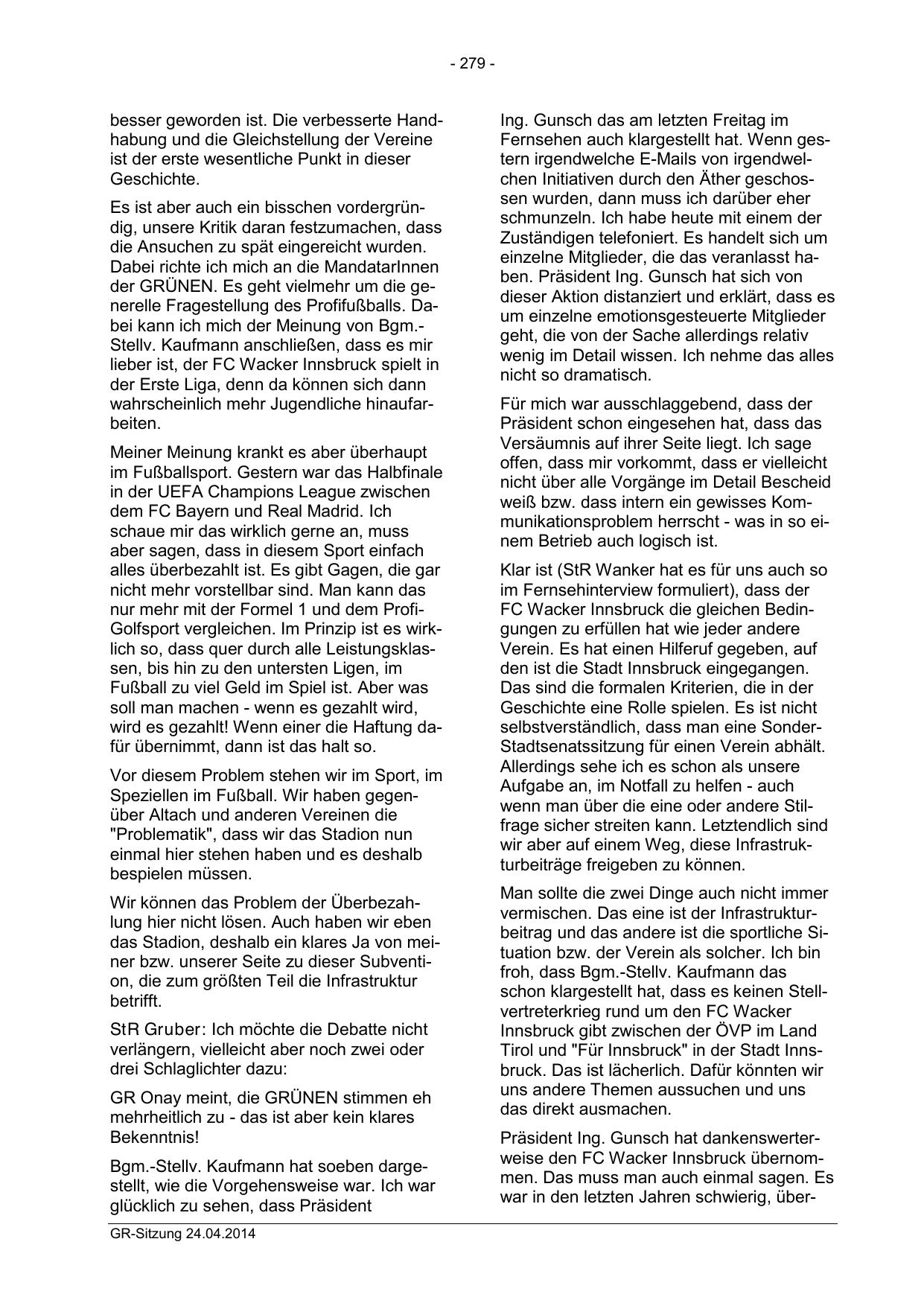 der GRÜNEN. Es geht vielmehr um die generelle Fragestellung des Profifußballs. Dabei kann ich mich der Meinung von Bgm.Stellv. Kaufmann anschließen, dass es mir