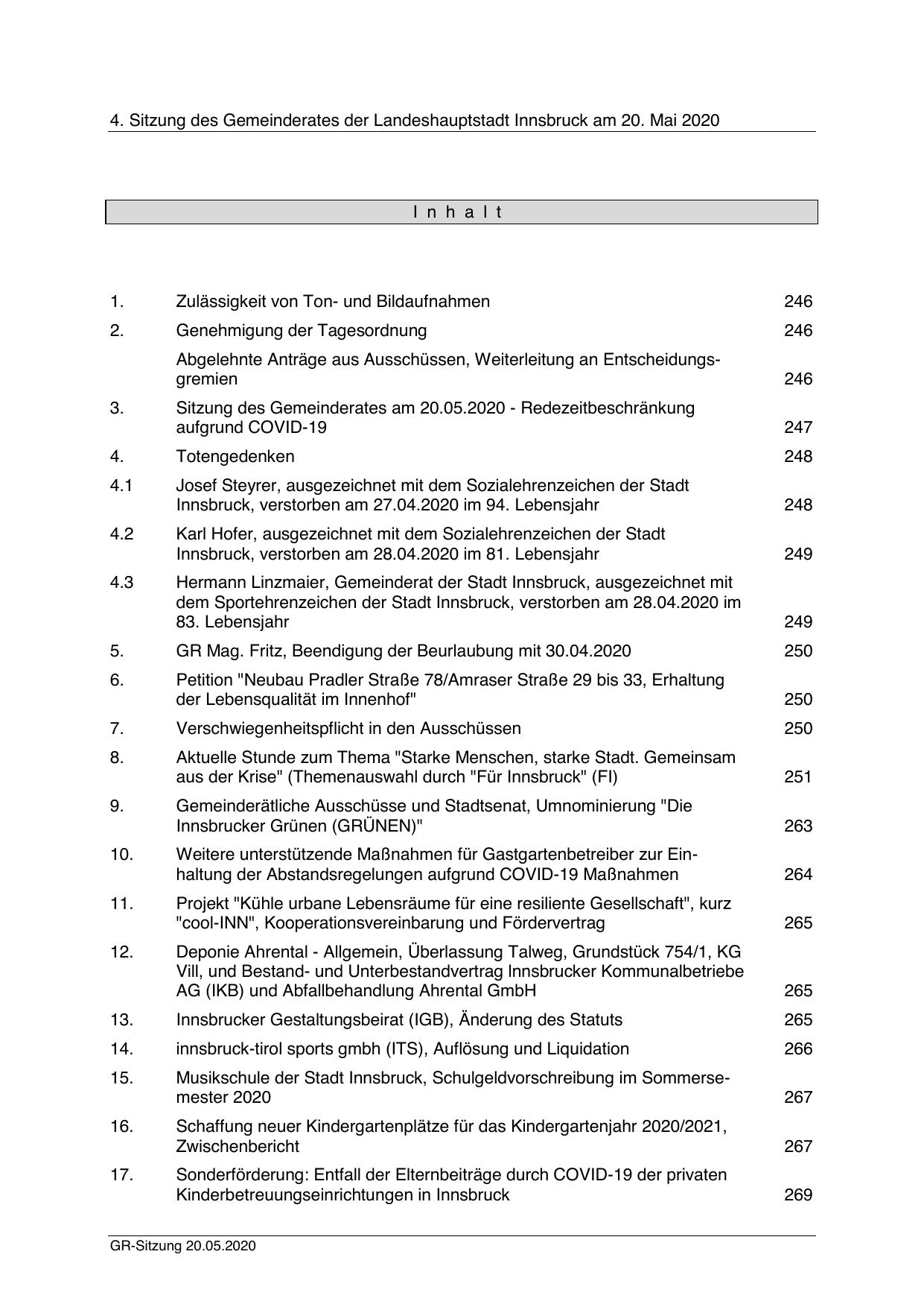 4. Sitzung des Gemeinderates der Landeshauptstadt Innsbruck am 20. Mai 2020