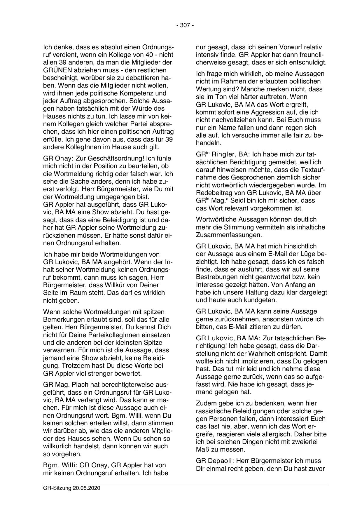 GR Appler hat ausgeführt, dass GR Lukovic, BA MA eine Show abzieht. Du hast gesagt, dass das eine Beleidigung ist und daher hat GR Appler seine Wortmeldung zurückziehen müssen. Er hätte sonst dafür einen Ordnungsruf erhalten.
